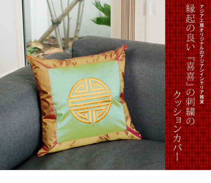 漢字の『喜』を二つ重ねた『喜喜』を刺繍したクッションカバー。『喜喜』とは、中国などで結婚式などのおめでたい時に用いられる飾り文字です。日本語にも同じように喜び、楽しいと言う意味合いがある縁起の良いモチーフです。 ベトナムの職人が手作りで編みあげて作られたクッションカバーは、高級感溢れる質感と上品な光沢が特徴的。いつものお部屋にオリエンタルな雰囲気をプラスしてくれるアイテムです。アジアンテイストやチャイニーズモダンなどにもぴったり。 華やかさもあり落ち着きのあるカラーのクッションカバーです。選べる5種類の豊富なカラー展開で、お部屋のイメージに合わせてお選びいただけます。