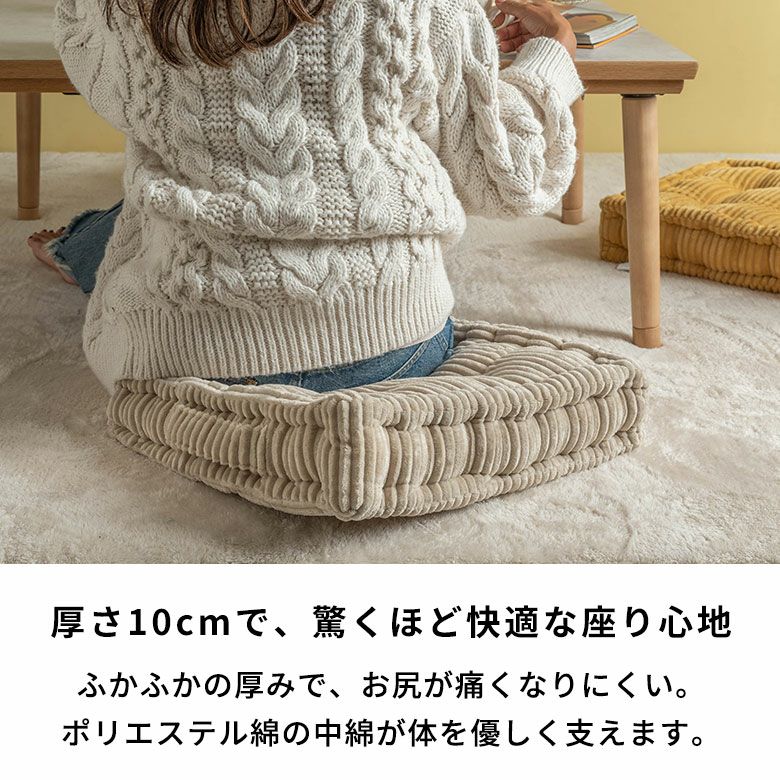 たっぷりの中わたで、床に座っていてもお尻が痛くなりにくい設計。厚さ10cmのポリエステル綿が体を優しく支え、底つき感がない快適な座り心地を実現しました。