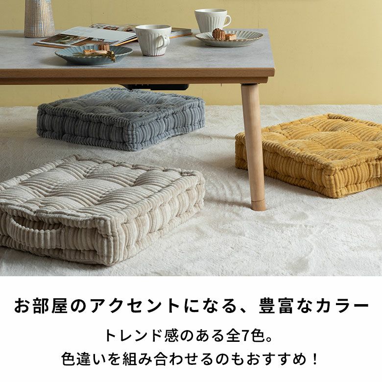 カラーはベーシックもアクセントも豊富に揃った全7色。同シリーズのこたつ布団と組み合わせて、統一感のあるコーディネートも楽しめます。日々の暮らしに寄り添う、心地よさとデザイン性を兼ね備えたフロアクッションです。