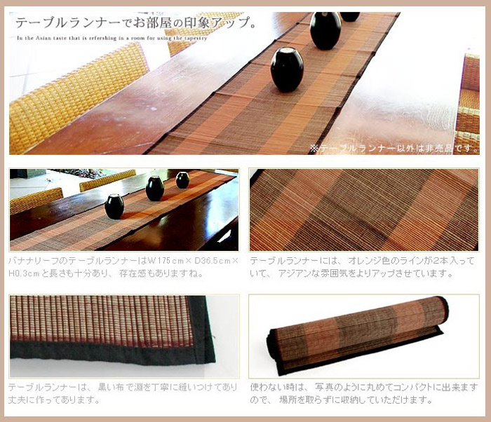 | バリ島の職人が一つ一つ丁寧に編みあげたテーブルランナーは、ぬくもり感じるアイテムです。バナナツリーというバリ島ならではの天然素材を使用し、優しい風合いを感じられる一品です。2本のオレンジのラインがアジアンな雰囲気をより引き立てています。落ち着いた色合いはモダンなお部屋にもマッチしますよ。ダイニングテーブルやカフェテーブルの中央に飾ってテーブルランナーとして使ったり、イカットハンガーと組み合わせてアジアンタペストリーとしても使えるファブリックです。 | ||||
