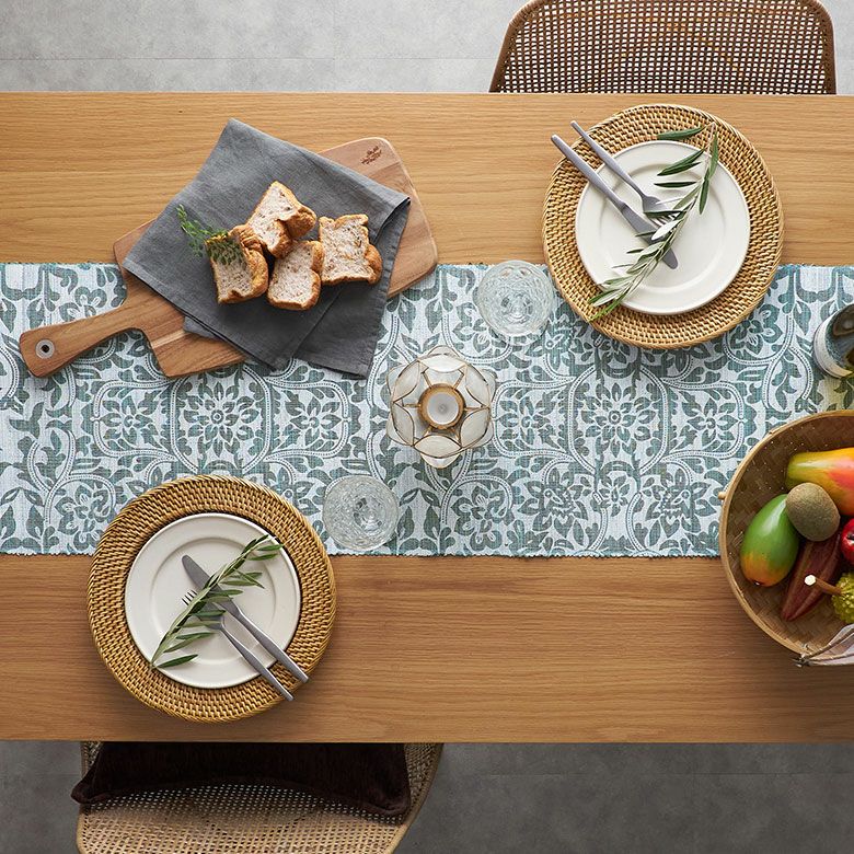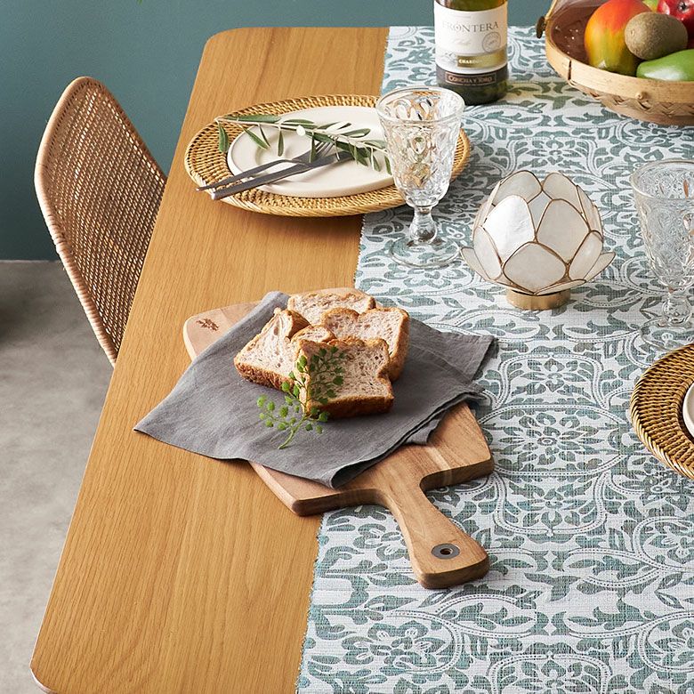 エスニックな植物柄とターコイズグリーンが、テーブルを可愛く飾ります。