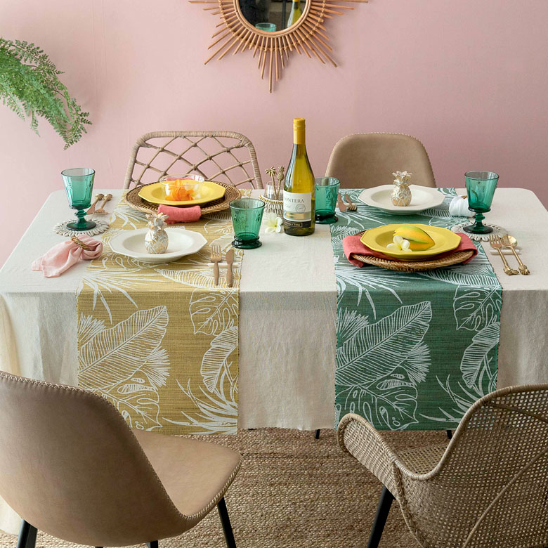 いつもの食卓をぐっと華やかにしてくれる、リーフ柄のテーブルランナー。
