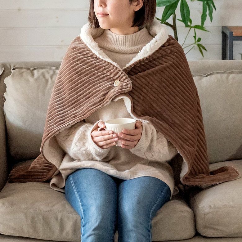 さっと羽織れば、着る毛布のように あたたか。冬の定番、コーデュロイは 保温効果も抜群で、寒い季節はもちろん、 エアコンの寒さ対策にもおすすめです。 ボタンが付いているので、 羽織りとしてご使用時にズレることなく お使いいただけます。 |