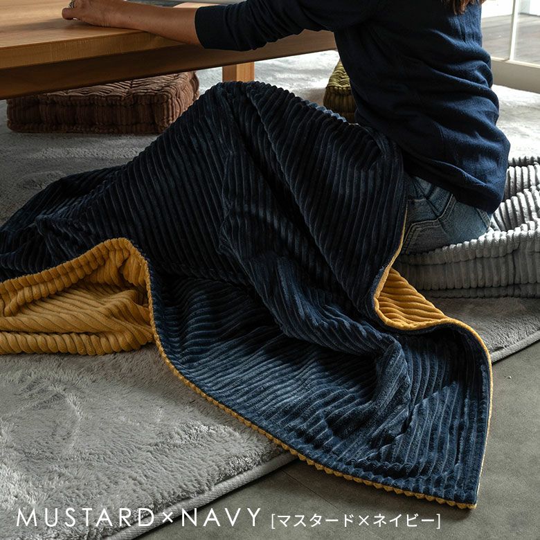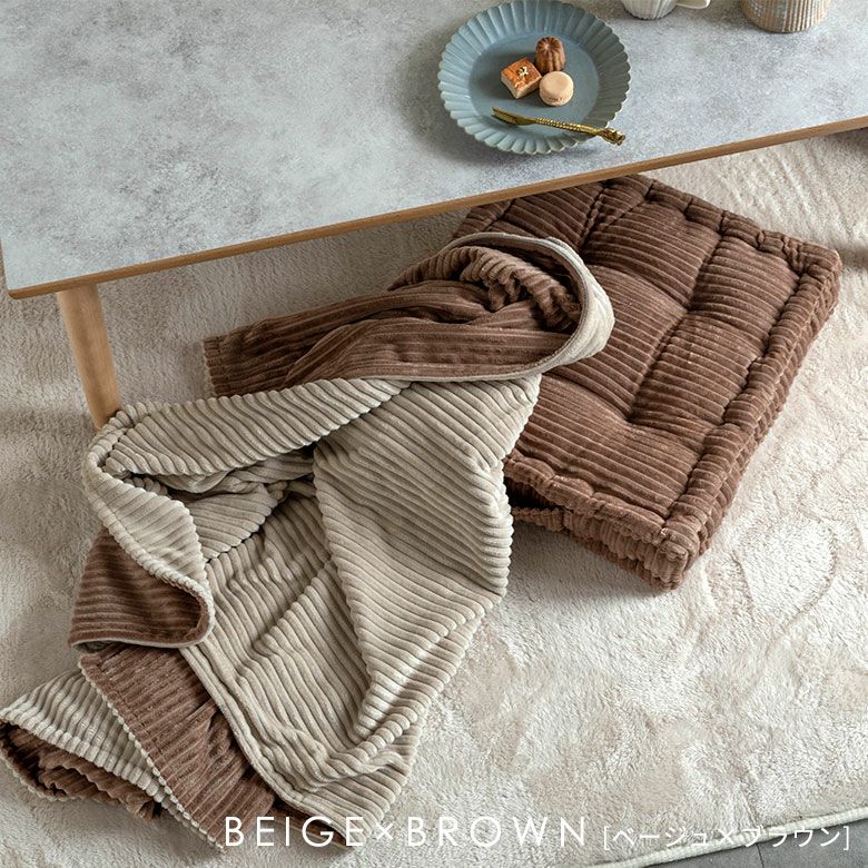 表裏で異なるカラーが楽しめるリバーシブル仕様。その日の気分やお部屋の雰囲気に合わせて色を変えることができます。こたつ布団やクッションと色をリンクさせるのもおすすめ。