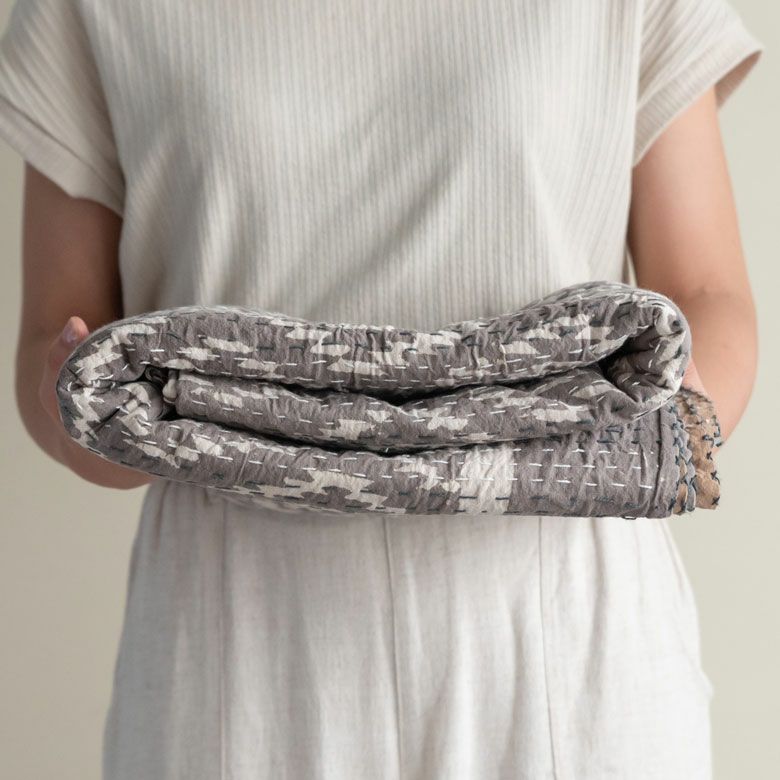 そしてこのスローは、同じく伝統的であるカンタ刺繍を取り入れ、手縫いで仕上げたもの。