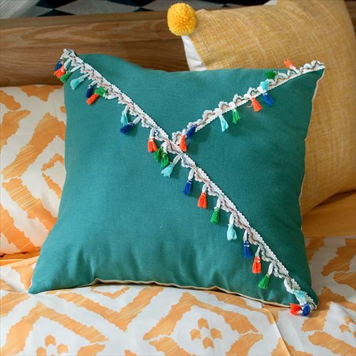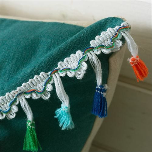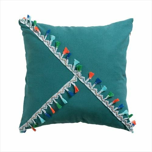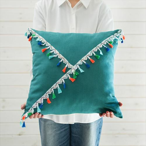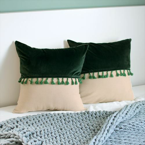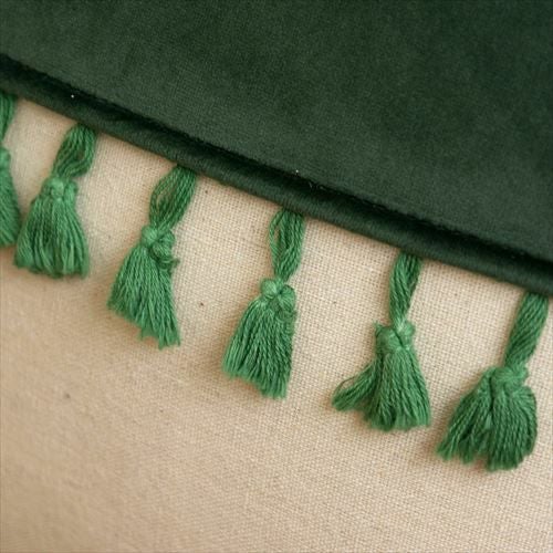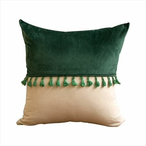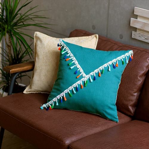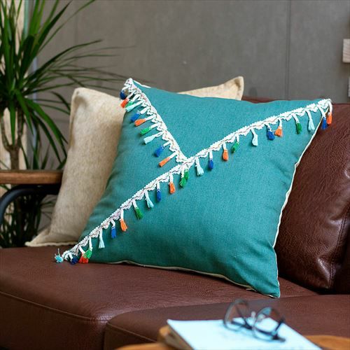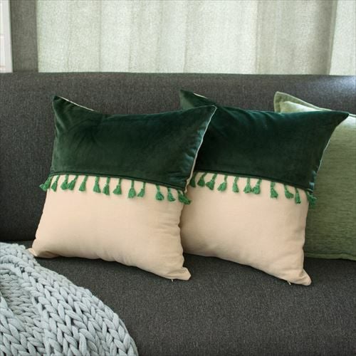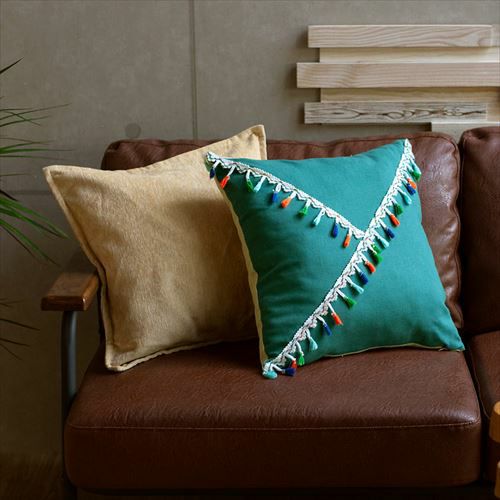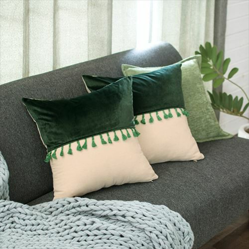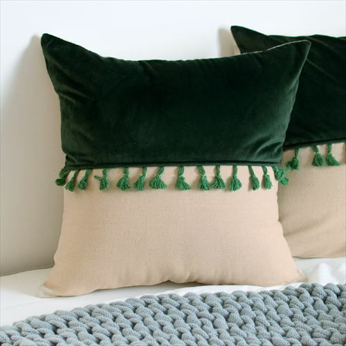 リゾート~エスニックまで対応カラーブロッククッションカバー。 【メール便対応】 タッセル付き クッションカバー 45×45cm カラーブロック ベルベット グリーン (66549)【クッション カバー 45角 北欧 おしゃれ 正方形 四角 かわいい シンプル 腰あて ピロークッション 海外 ファブリック プレゼント メール便 模様替え 緑 リネン リゾート】