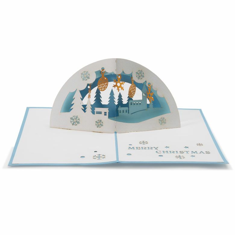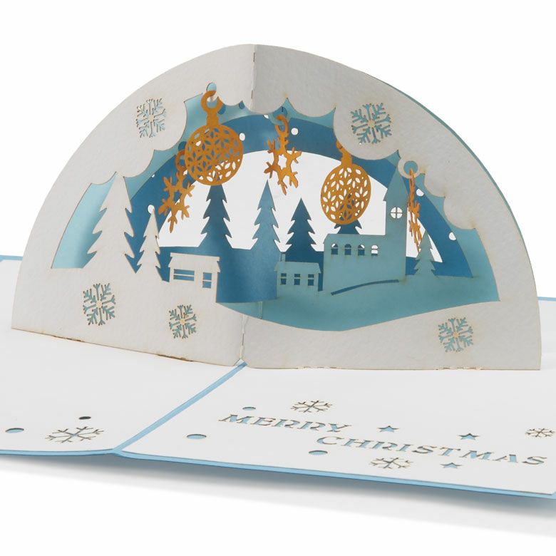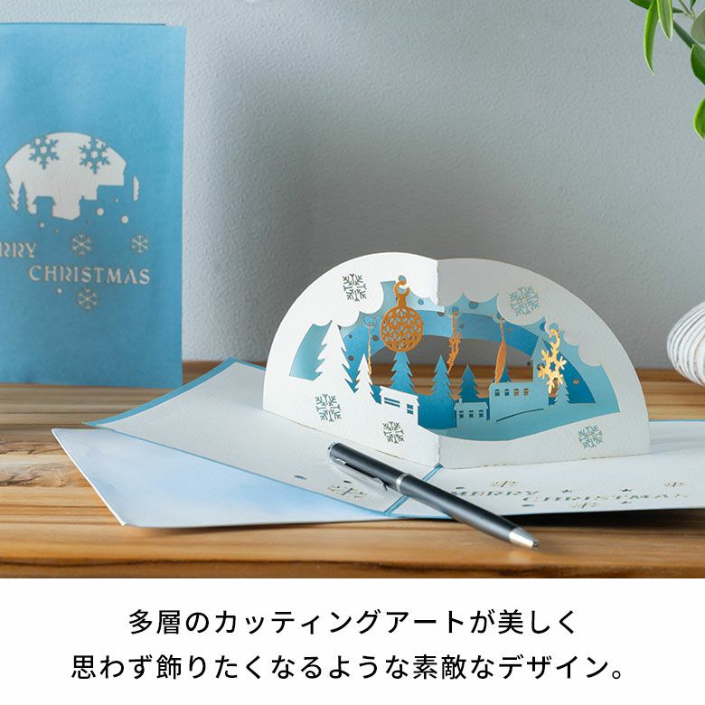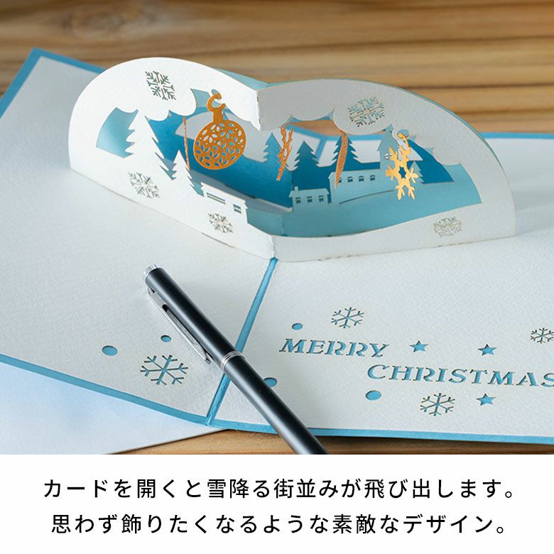 ・雪降る街並みとゴールドのオーナメントが飛び出す、開いて楽しい立体ポップアップのクリスマスカード