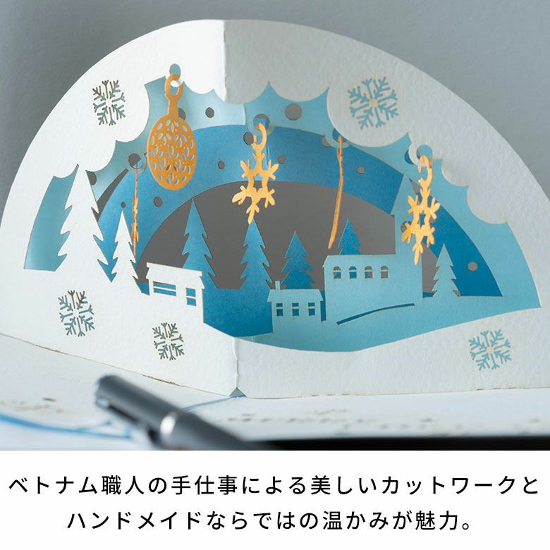 繊細な多層のカットワークが美しく、ベトナムの職人が一つひとつ丁寧に仕上げた、手作りならではの温もりが魅力です。淡いブルー×アイボリーの清らかで洗練された配色に、レーザーカットの切り絵が織りなすアートのような仕上がり。読み終えた後も立てて飾って楽しめる、特別な一枚です。