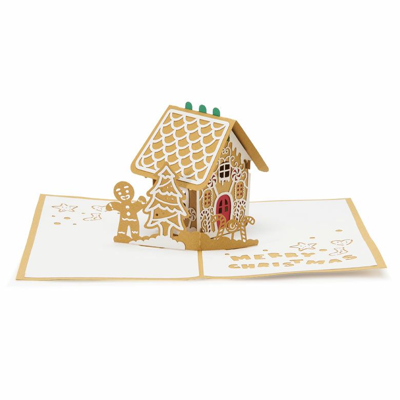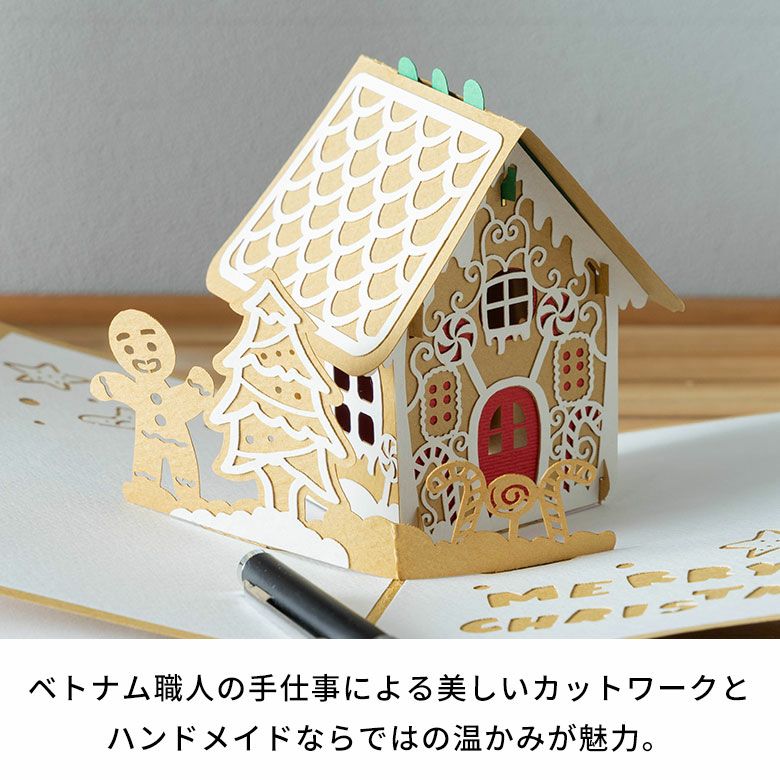 ベトナムの職人による繊細なカットワークが美しいポップアップ立体クリスマスカード グリーティングカード [Gingerbread House - ジンジャーブレッド・ハウス] [51378]