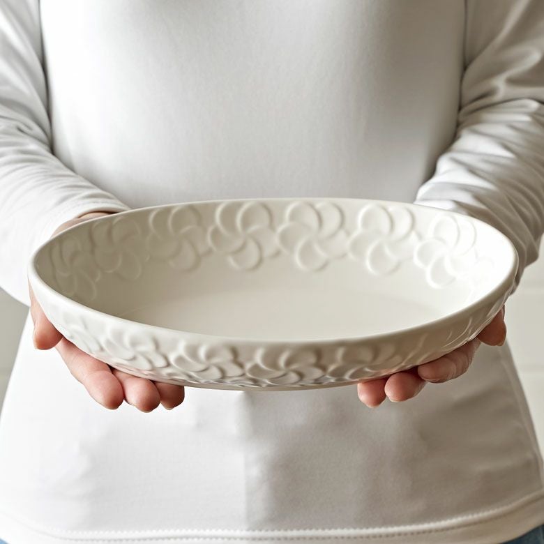 エンボス加工で皿まわりをぐるりと囲むプルメリアデザイン。
