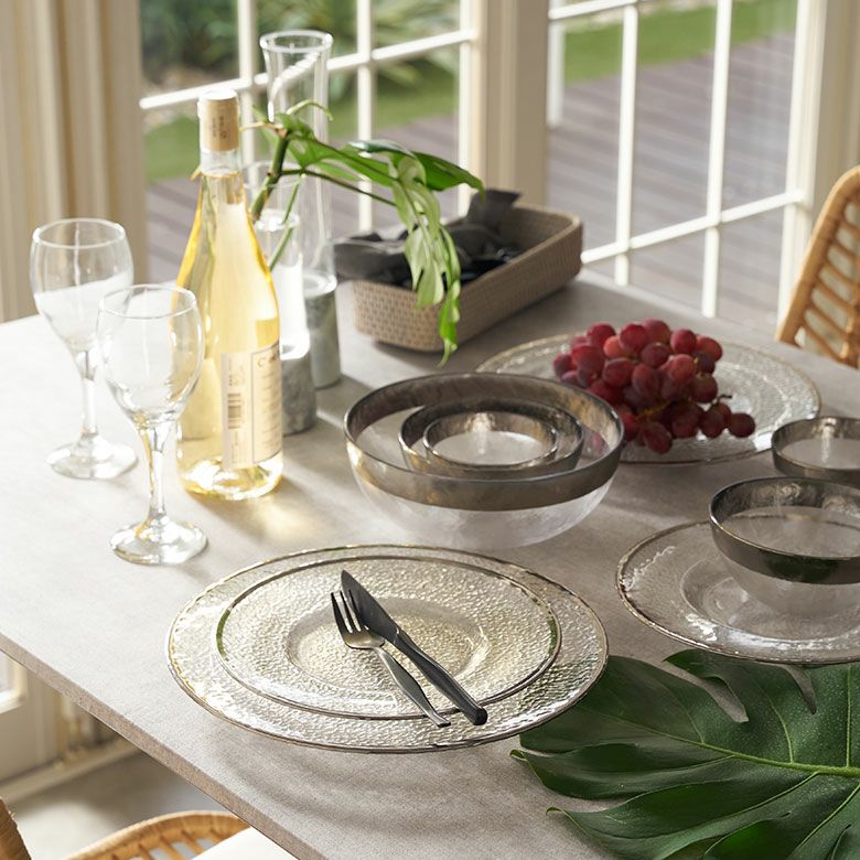 きらびやかなリムがアクセントになった、ソーダガラスのプレートです。アジア工房自慢のバリエーション豊富なテーブルアイテムともコーディネートしやすいクリアーなガラスプレートをご用意しました。こちらは、サラダやフルーツなどに汎用性が高い22cmサイズです。普段使いはもちろん、特別な日にも使っていただけるプレートです。シリーズで揃えておもてなしの器としてもおすすめです。