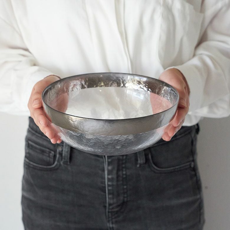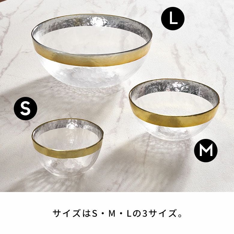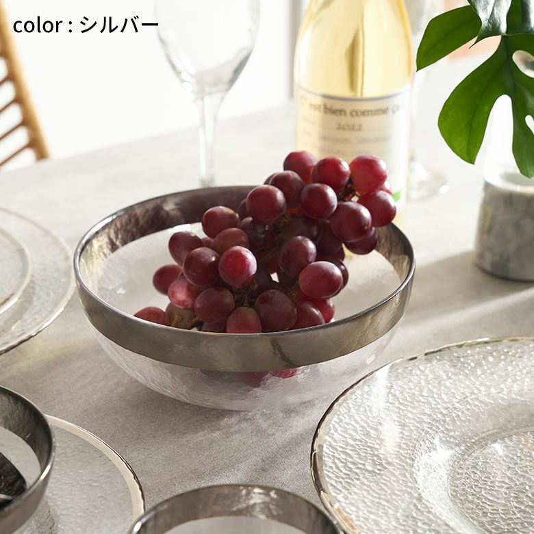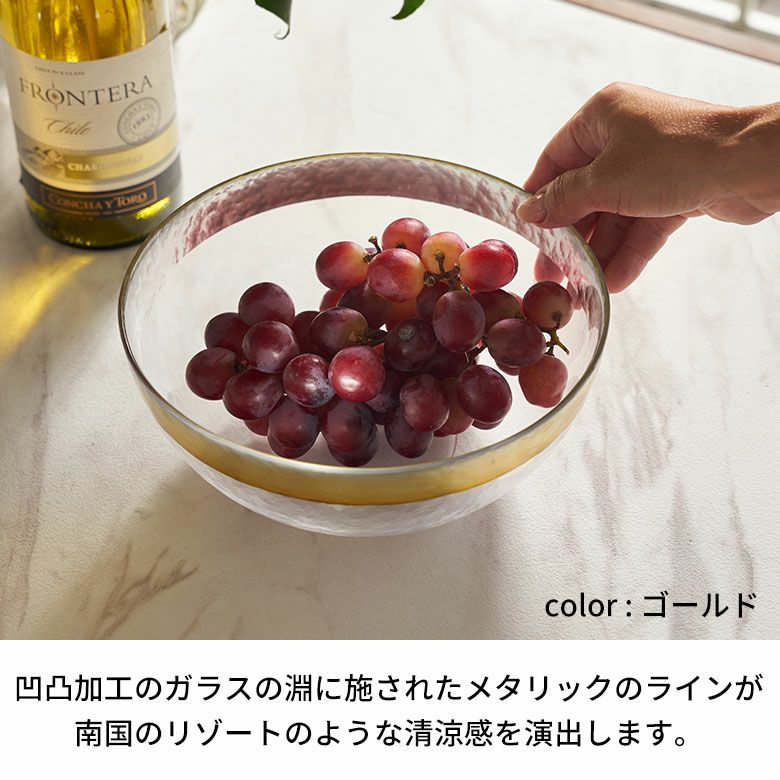 きらびやかなリムがアクセントになった大きいサイズのガラスボウル。アジア工房自慢のバリエーション豊富なテーブルアイテムともコーディネートしやすいクリアーなガラスボウルをご用意しました。こちらは、サラダボウルとしても使える約20.5cmサイズ。大きなフルーツを入れても見栄えします。シリーズで揃えておもてなしの器としてもおすすめです。