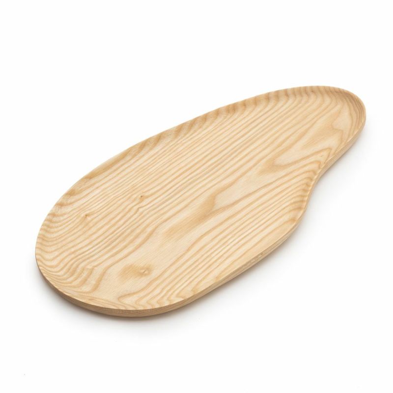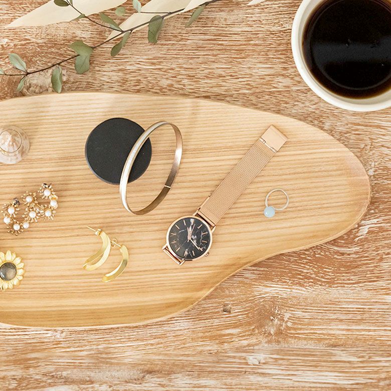 オーバルフォルムが柔らかな雰囲気で、実用度も満足のウッドトレイ。