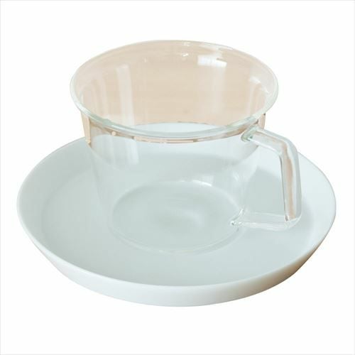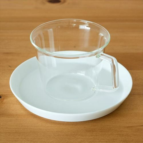 ガラスのカップと磁器製ソーサーの異素材を組み合わせたセット。