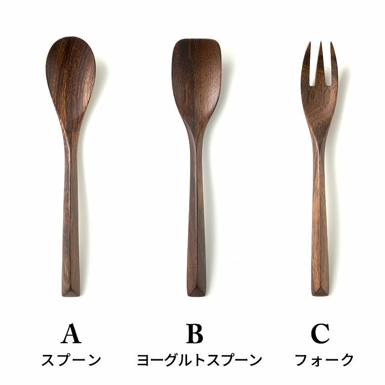 A:スプーン、B:ヨーグルトスプーン、C:フォークの3種類。