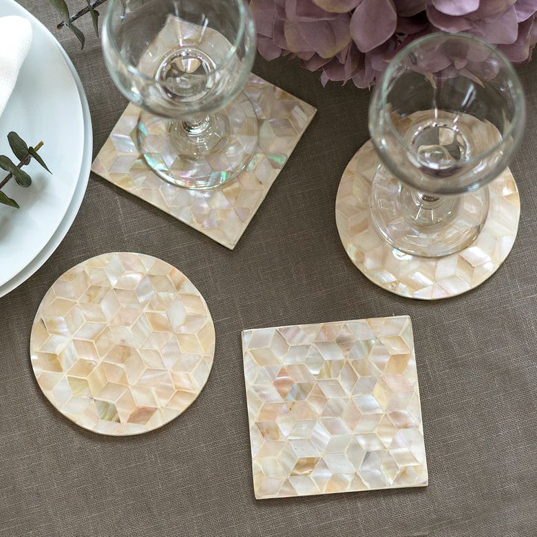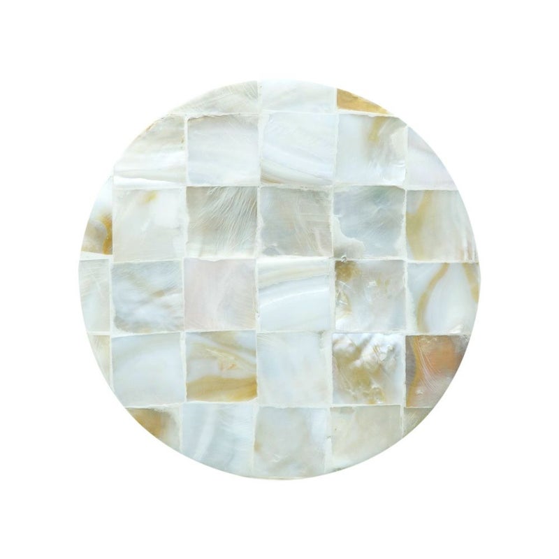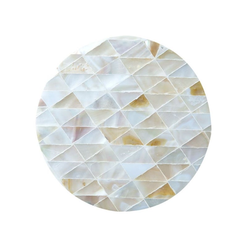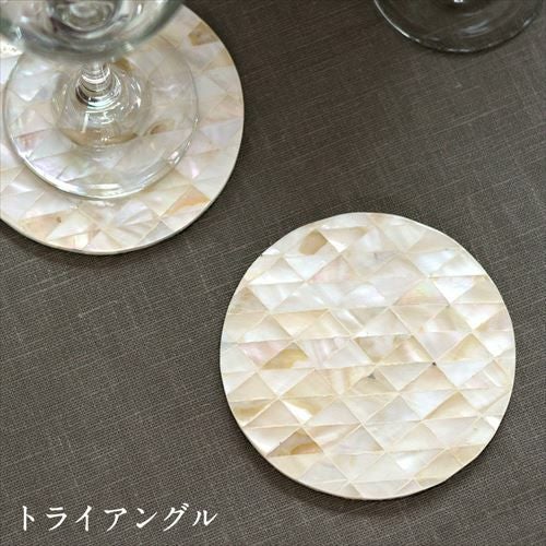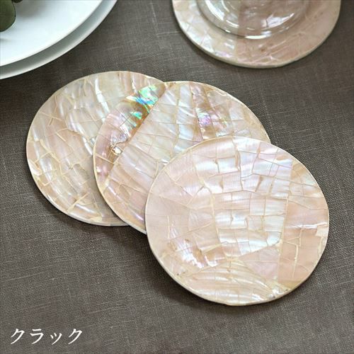 パールシェルをモザイクのように貼り合わせたコースター。