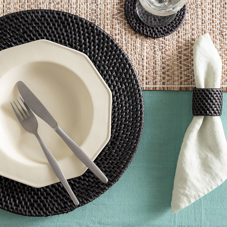洗練されたテーブルコーディネートを作る、エスプレッソブラックカラーのラタンアイテム。