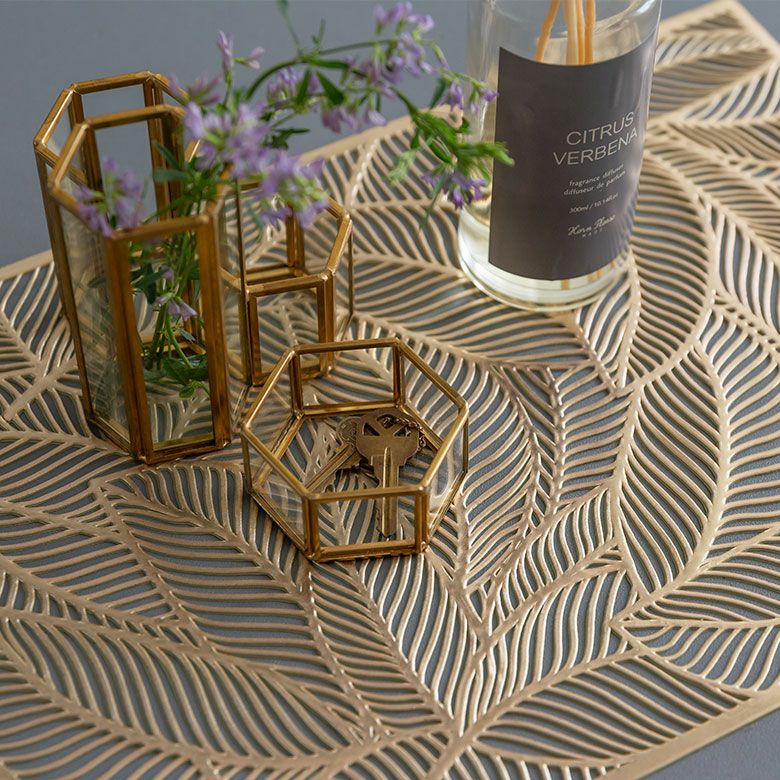 敷物 テーブルマット ダイニング キッチン テーブルコーデ 【メール便対応】ランチョンマット プレースマット リーフ 葉っぱ柄 ゴールド シルバー 金色 銀色 約 W 45cm D 30cm [67046]【 プレイスマット ランチマット 透かし模様 透かし柄 長方形 水洗い可 洗える 撥水 防水 おしゃれ 北欧 ハワイアン リゾート 南国 ホテルライク 】