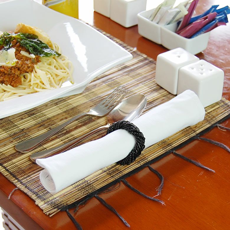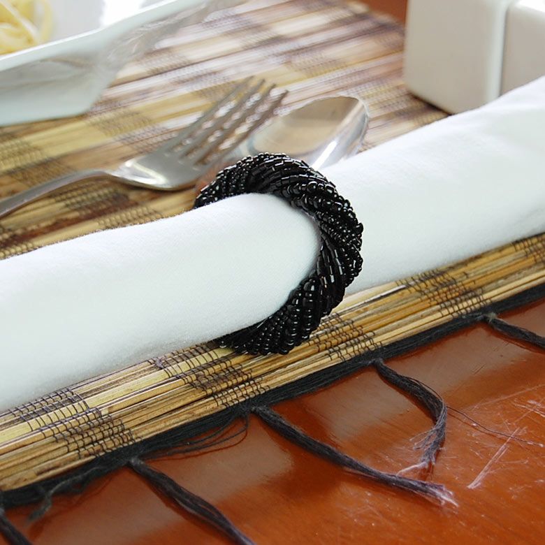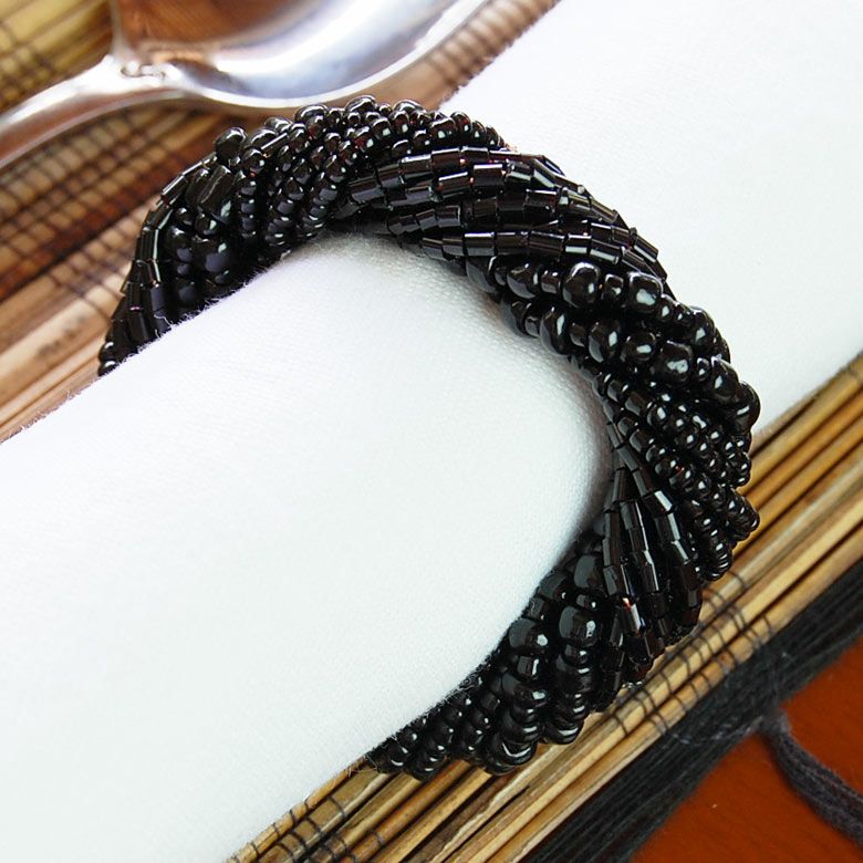 ビーズで作られた綺麗なアジアンナプキンリング ブラックカラー 数種類のビーズをバリ島の職人の感性で綺麗にデザインされたビーズで出来たナプキンリングは、普段の食卓をこれ一つでレストランのような雰囲気に変えてくれる、アイテムです。 |