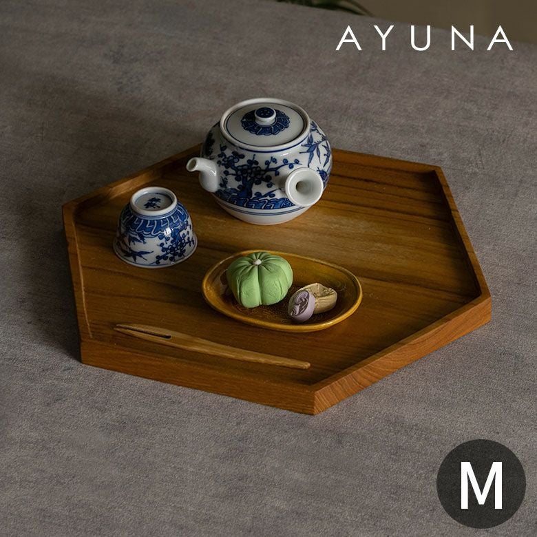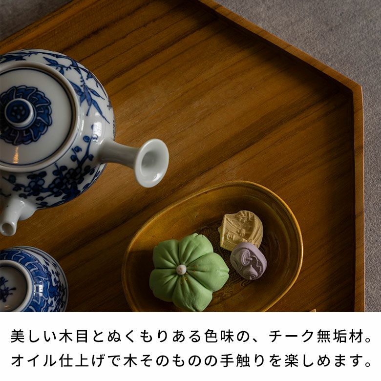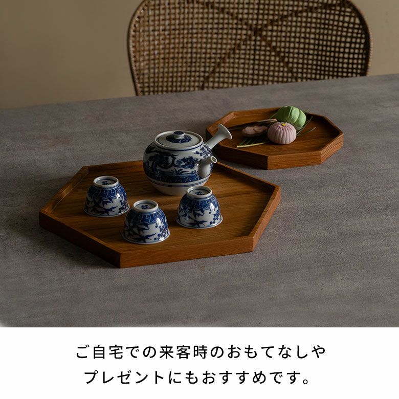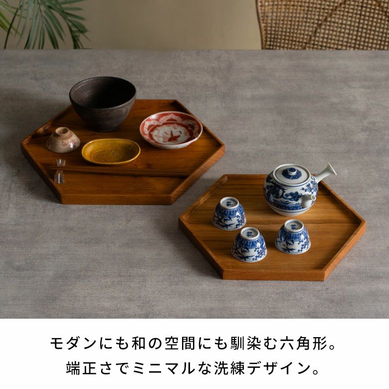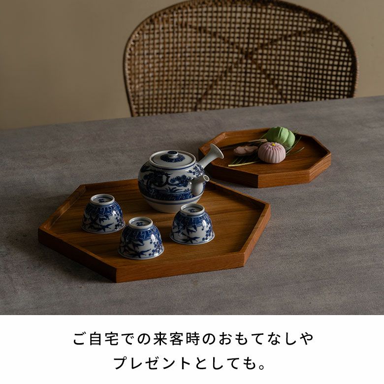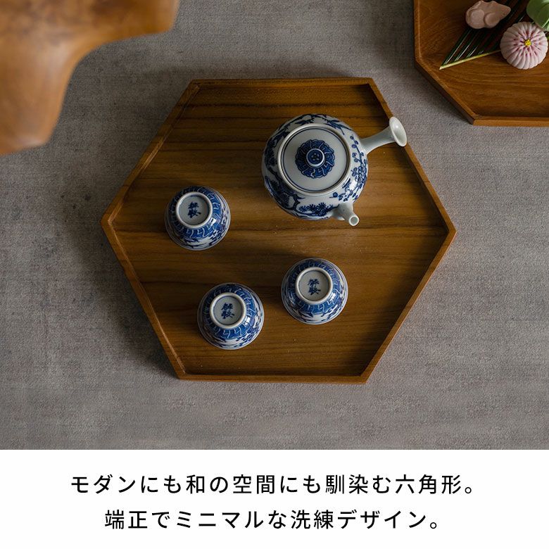 小皿や豆皿を載せるお盆として食卓に出したり、急須と湯呑を載せて、和のお茶時間に。モダンな六角形なので、洋風のテーブルコーディネートにも。