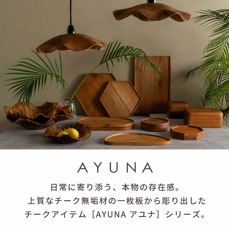 Ayunaはサンスクリット語に由来し、「生命」「歩み」を意味する言葉。穏やかな響きの中に、チークが持つあたたかさと生命力を映し出します。一枚ごとに異なる木目の表情が特別感を添え、使うほど艶をまといながら美しく育つ―― そんな経年変化も魅力。大切な方へのギフトにもふさわしい一品です。