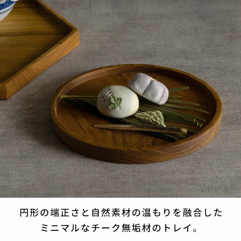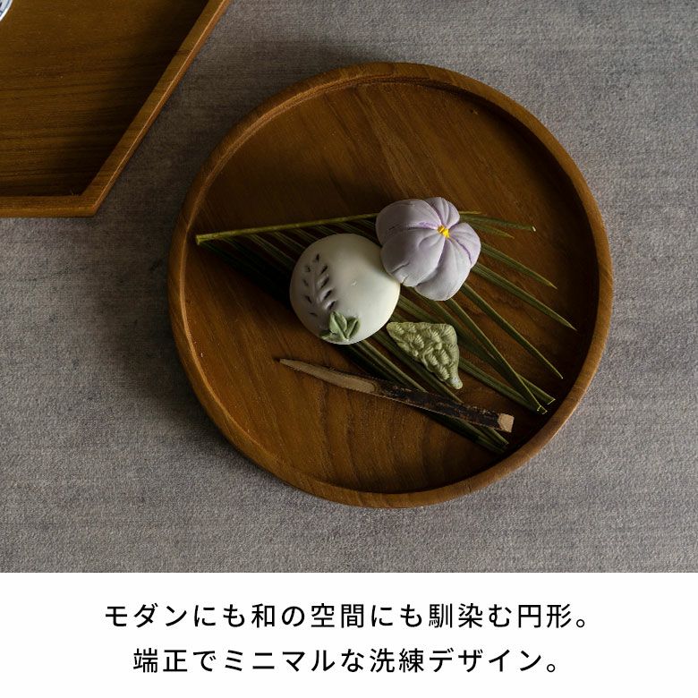 小さめのお茶菓子を載せて、和のお茶時間に。同シリーズの六角形トレイ(写真左)と組み合わせると、統一感が生まれ、さらに特別感のあるコーディネートに。シンプルな円形なので、洋風のテーブルコーディネートにも。