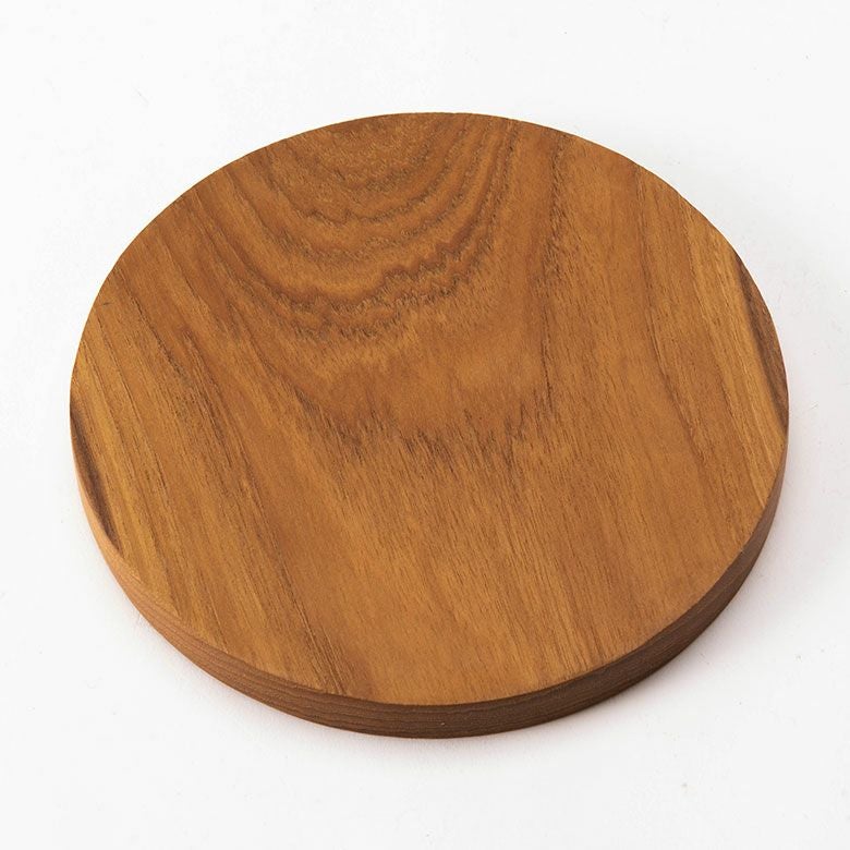 一枚板のチーク無垢材から彫り出した贅沢な逸品です。ラッカー塗装などの樹脂塗装に頼らず、食品用の安全基準を満たしたオイルのみで仕上げているため、天然木そのものの手触りをお楽しみいただけます。使うほど色艶が深まり、年月と共に表情が変わるのも魅力。コンパクトな直径約17cmの円形で、コースターや小物トレイなど、使い方は様々。日々の暮らしに自然と溶け込む万能アイテムです。
