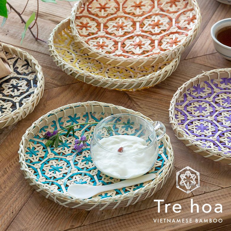 カラフルな竹ひごで均一に編まれた花柄模様が目を引くラウンドトレイ。