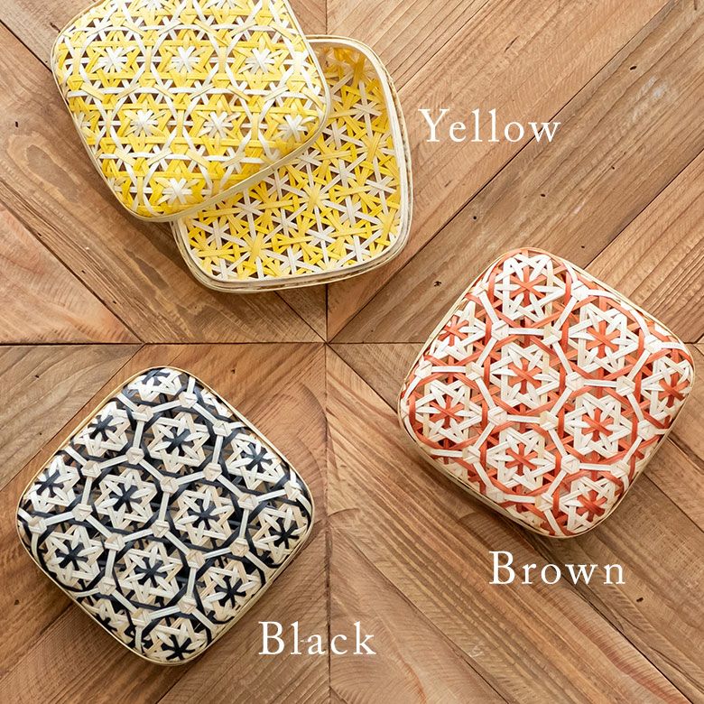 カラフルな竹ひごで均一に編まれた花柄模様が目を引く蓋付きボックス。