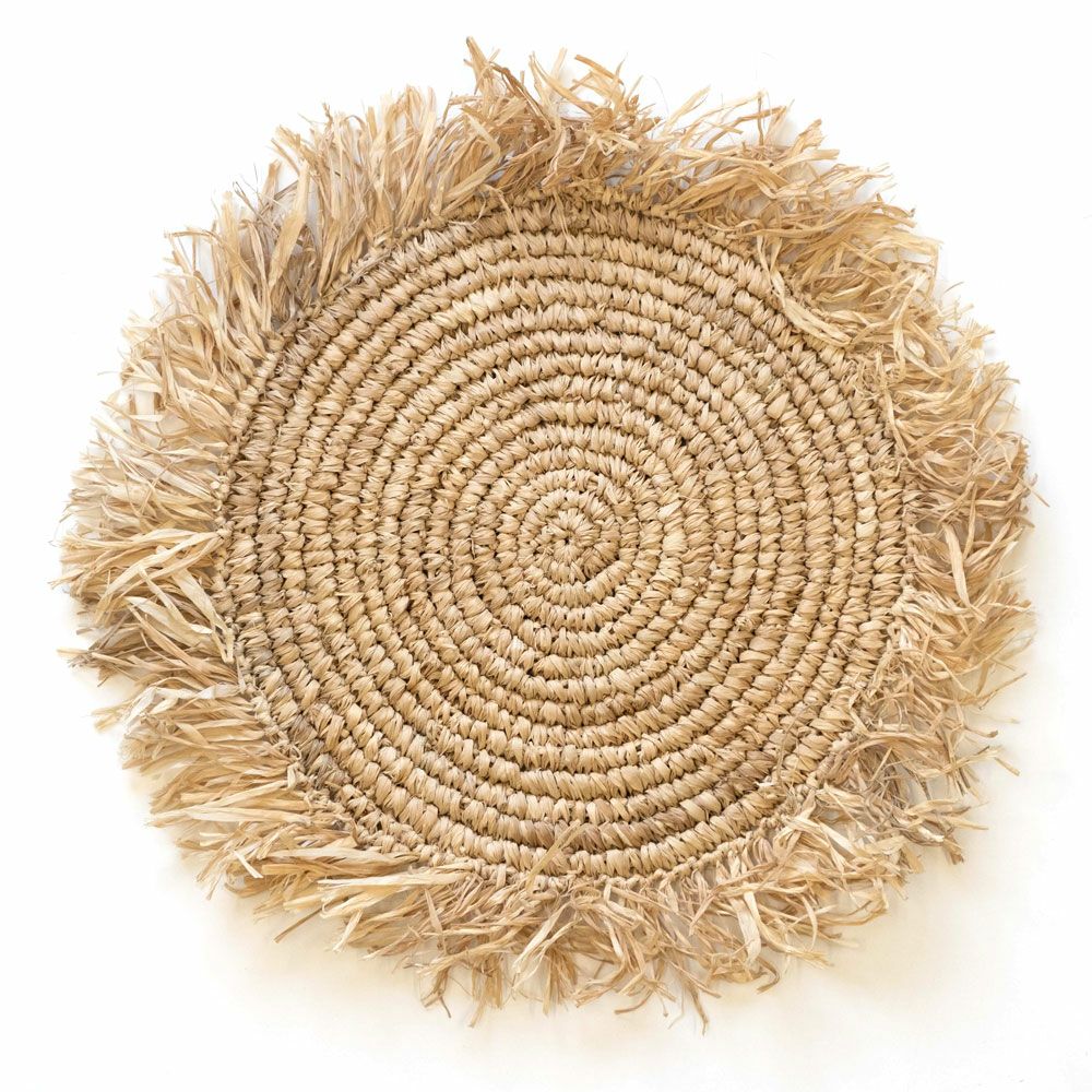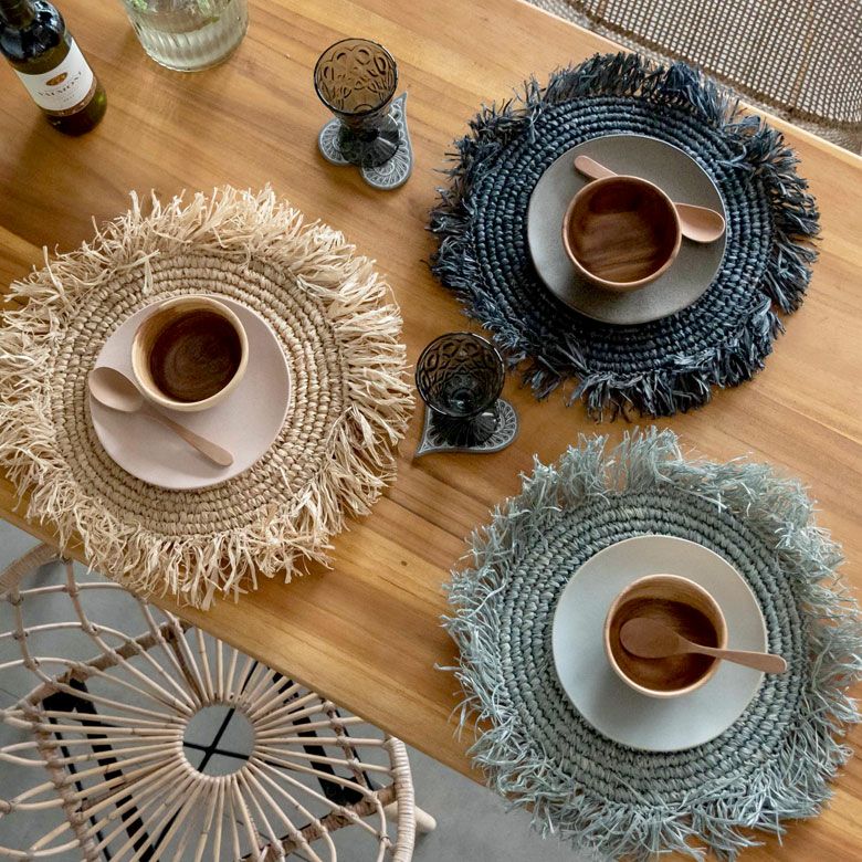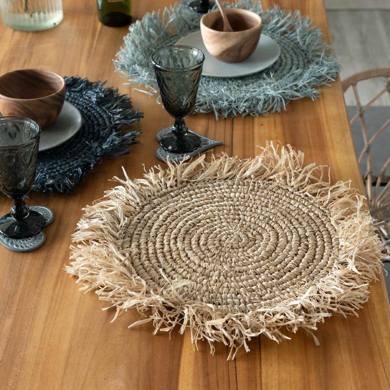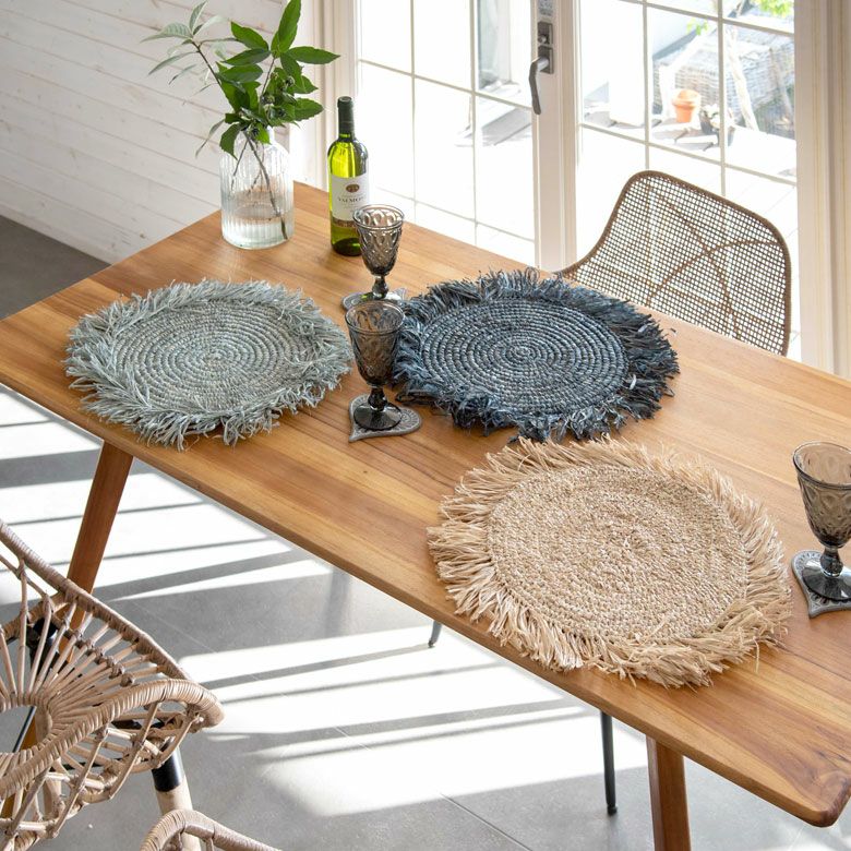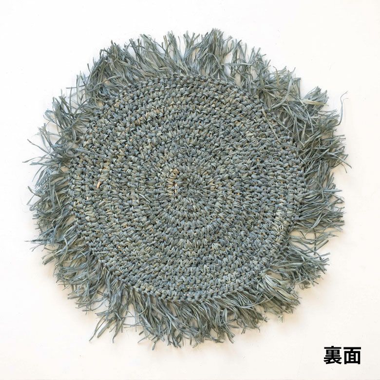 プレイスマット プレースマット キッチン雑貨 リゾート ビーチ ランチョンマット 天然素材 ラフィア フリンジ付き 32cm × 32cm [13880-a]【 ランチマット おしゃれ 椰子 素材 麦わら かわいい インテリア 円形 丸 フリンジ ナチュラル リゾートインテリア ナチュラル ダークブルー ライトブルー アジアン 雑貨 アジアン雑貨 バリ島 】
