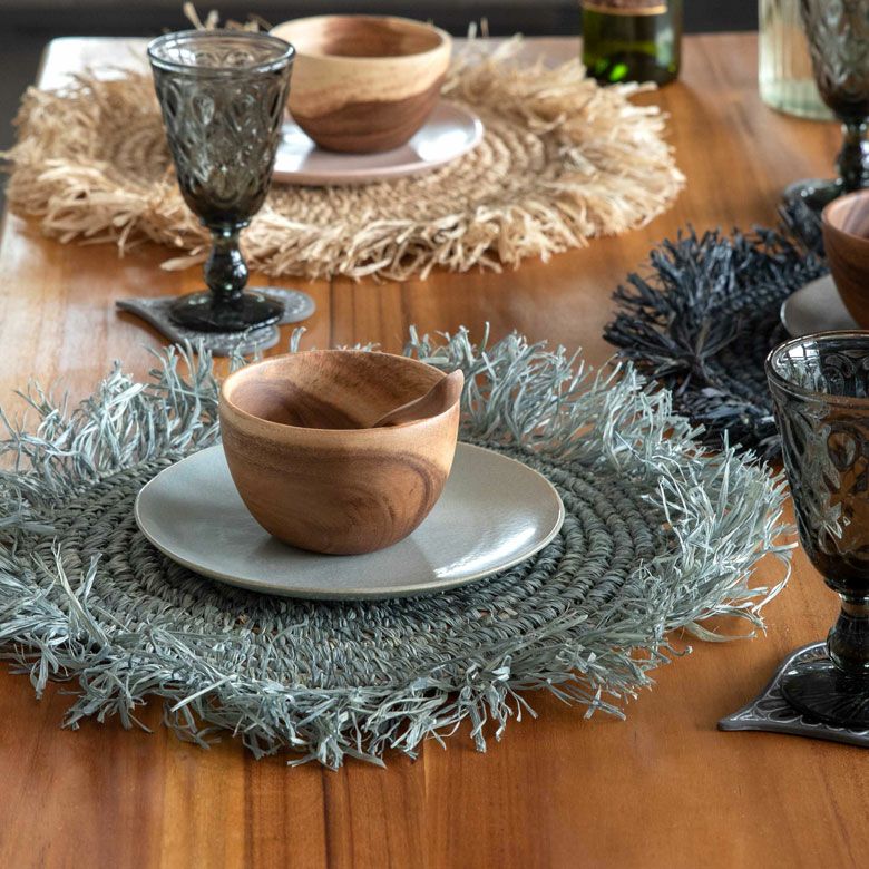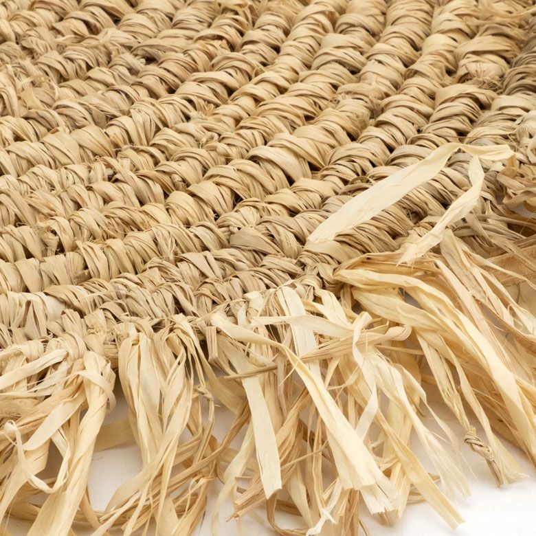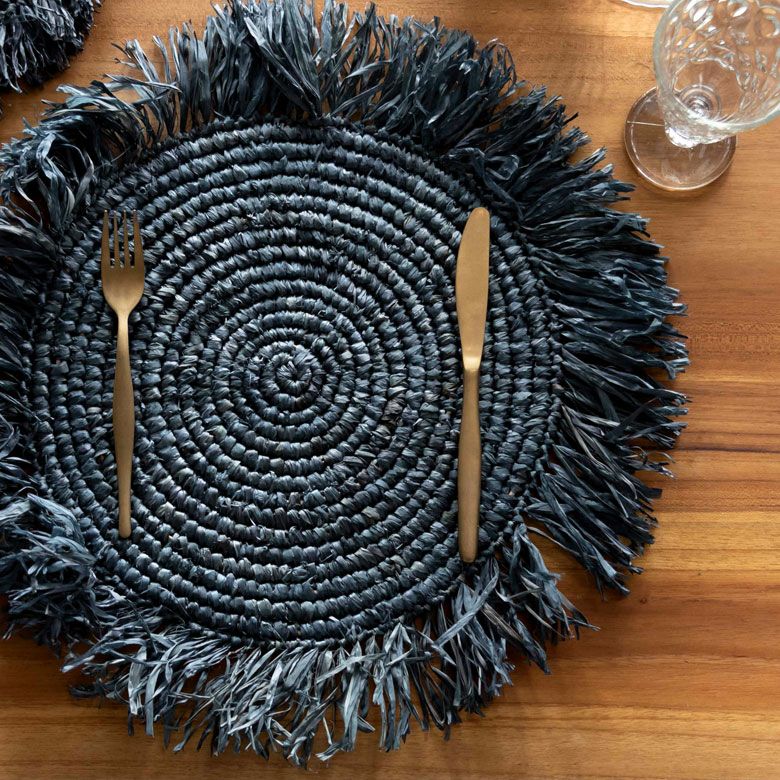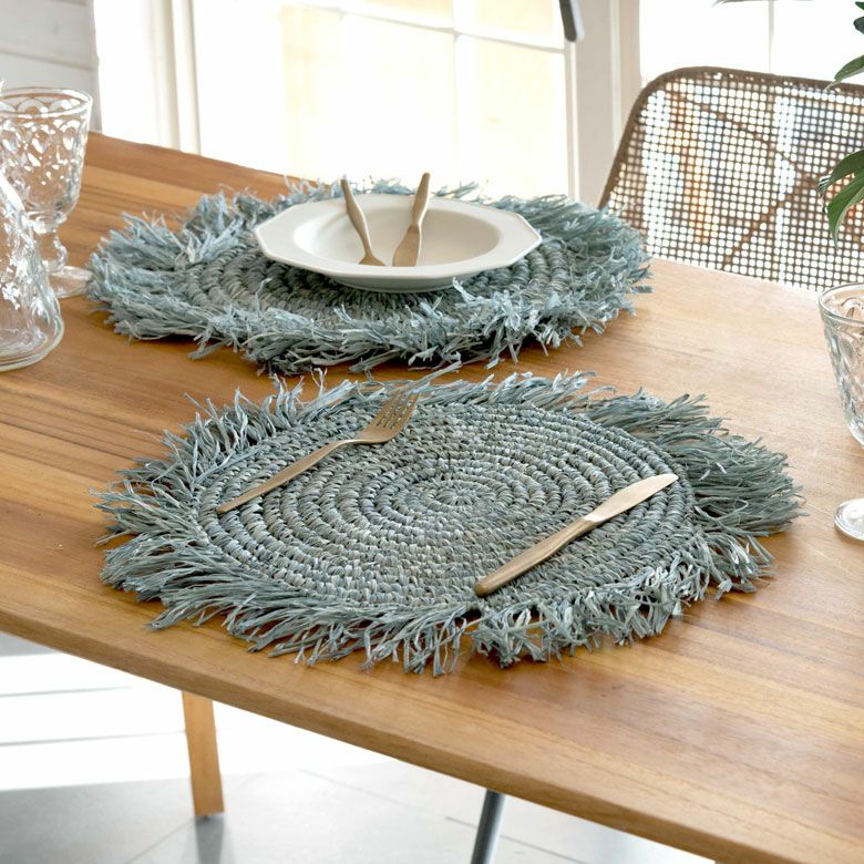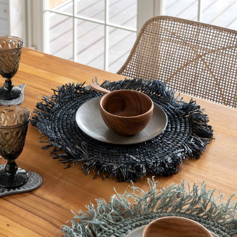 プレイスマット プレースマット キッチン雑貨 リゾート ビーチ ランチョンマット 天然素材 ラフィア フリンジ付き 32cm × 32cm [13880-a]【 ランチマット おしゃれ 椰子 素材 麦わら かわいい インテリア 円形 丸 フリンジ ナチュラル リゾートインテリア ナチュラル ダークブルー ライトブルー アジアン 雑貨 アジアン雑貨 バリ島 】