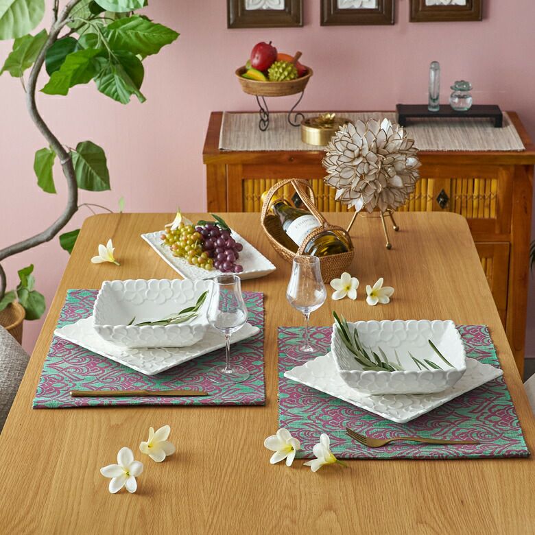 正角皿 深め リゾート テーブルコーディネート 深角皿 プルメリアモチーフ Lサイズ 21cm角 ホワイト グリーン 陶器製 [pl6-66821 pl6-66822]【 食器 スクエアボウル 深皿 スクエアプレート 角皿 角深皿 パスタ皿 おしゃれ キッチン雑貨 アジアン 雑貨 アジアン雑貨 】