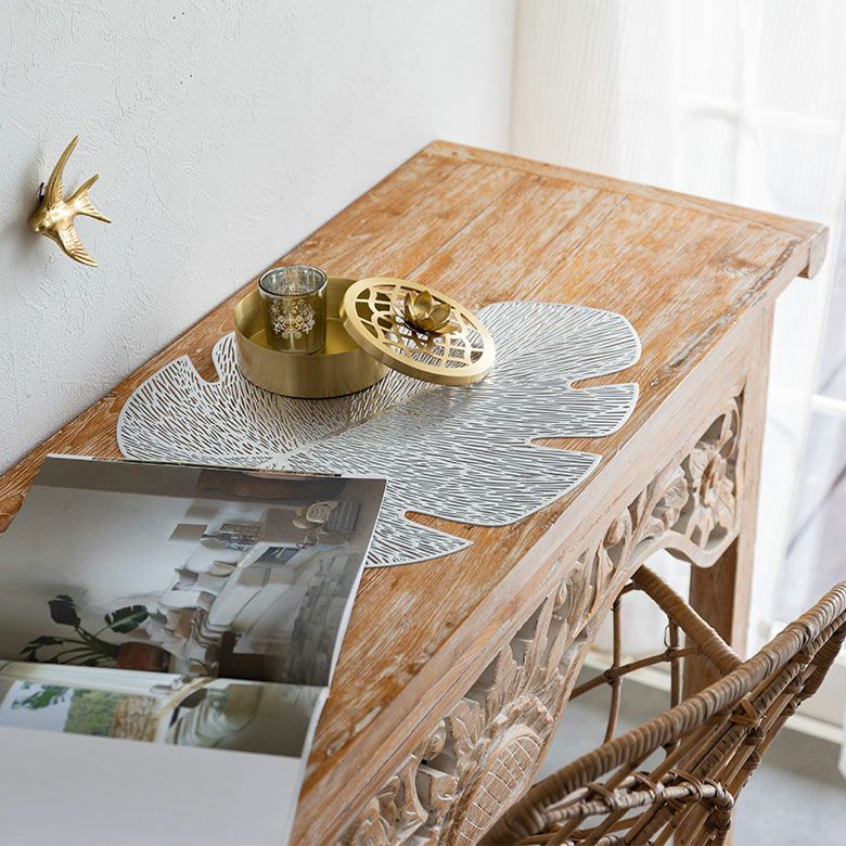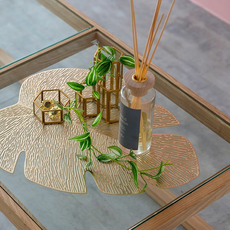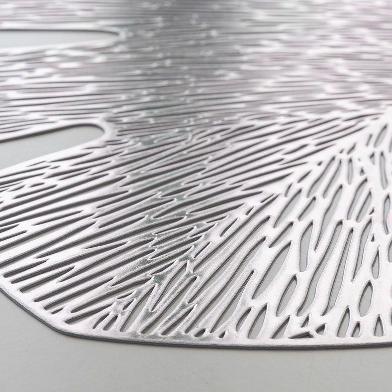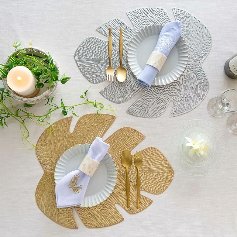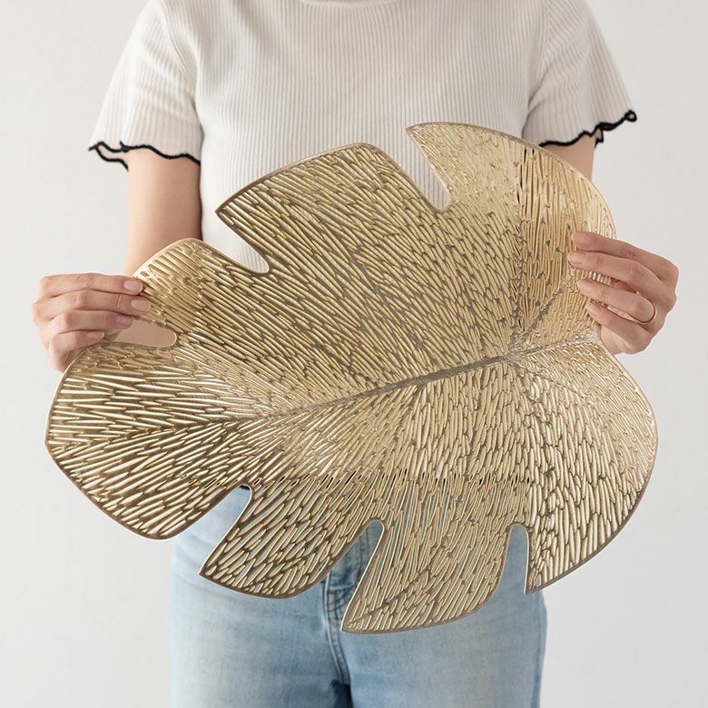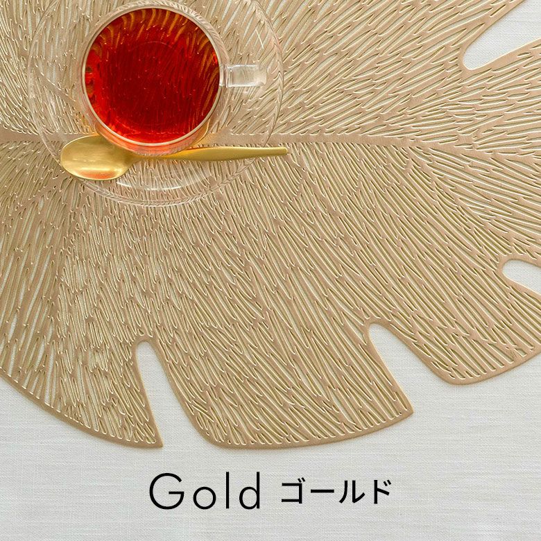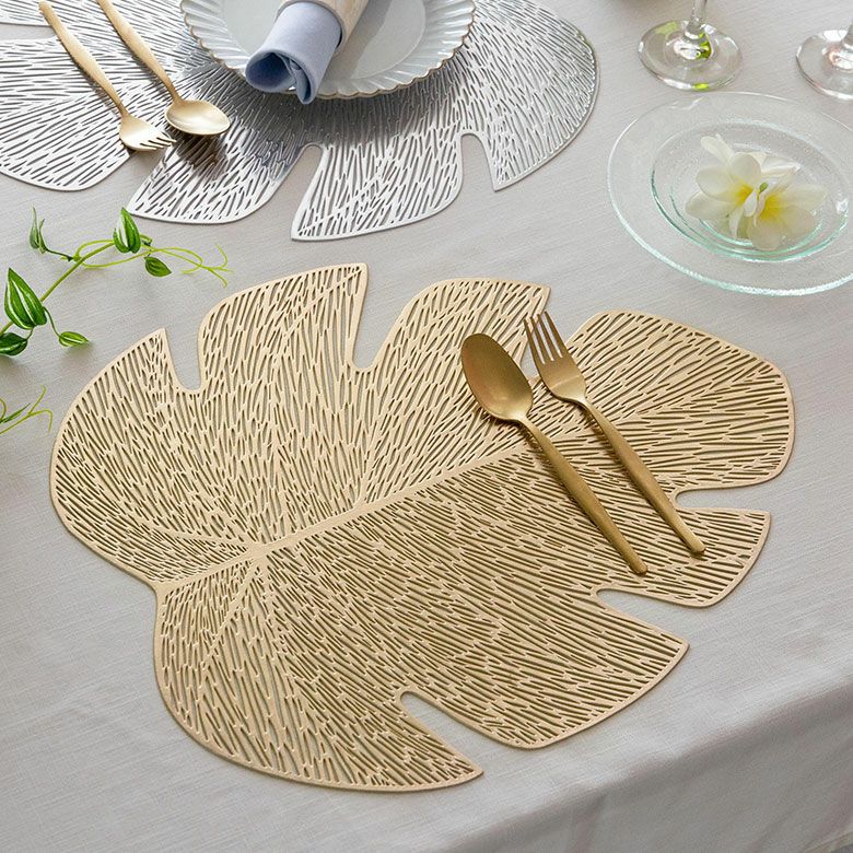 敷物 テーブルマット ダイニング キッチン テーブルコーデ ランチョンマット プレースマット モンステラ リーフ 葉っぱ ゴールド シルバー 金色 銀色 約 W 45cm D 37cm [67048]【 プレイスマット ランチマット 透かし模様 透かし柄 水洗い可 洗える 撥水 防水 おしゃれ 北欧 ハワイアン リゾート ホテルライク アジアン 雑貨 】