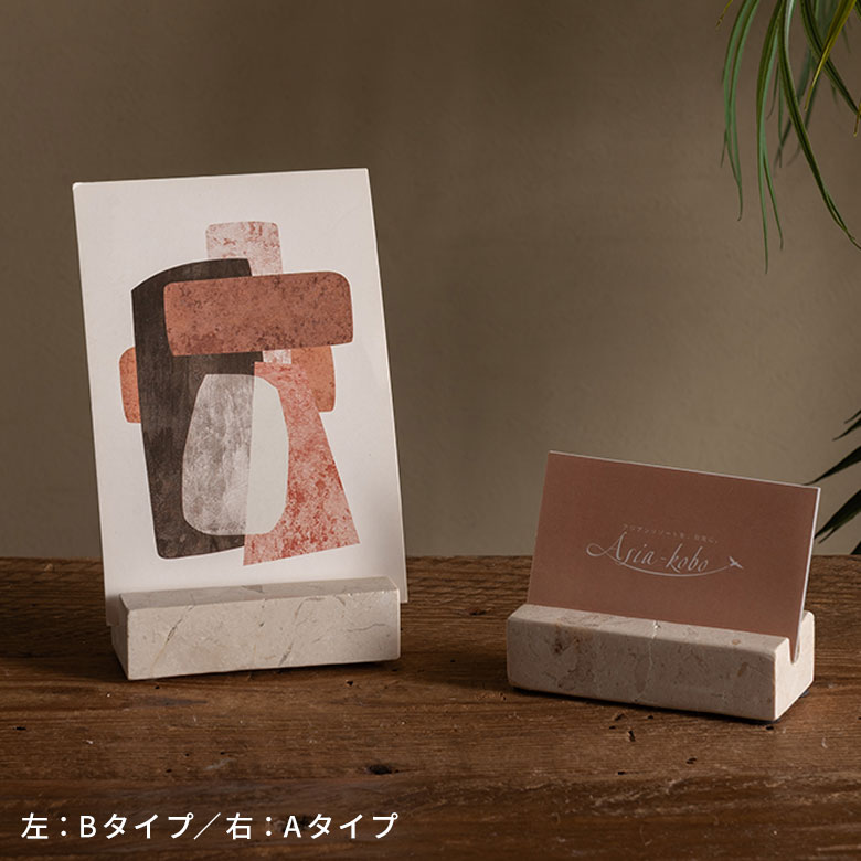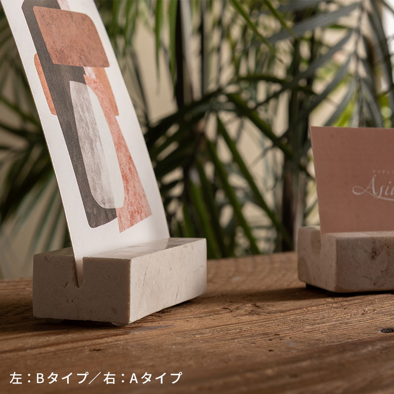名刺やショップカードのスタンドとして、またレストランの各テーブル用のメニュースタンドや、大切な記念日に添えるメッセージカードスタンドとしてもおすすめです。耐久性が高く、エシカルで長く愛用できる魅力的なカードスタンドです。天然大理石の素材そのものの魅力が引き立つ洗練されたカードスタンドは、ワンランク上のアジアンリゾートのような雰囲気を演出します。