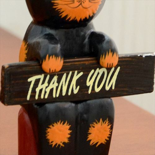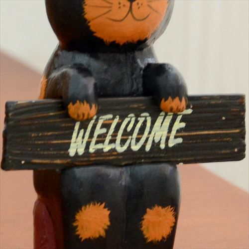 ネコの手に持たれたボードは、裏と表にそれぞれ『welcome』、『thank you』の文字が。