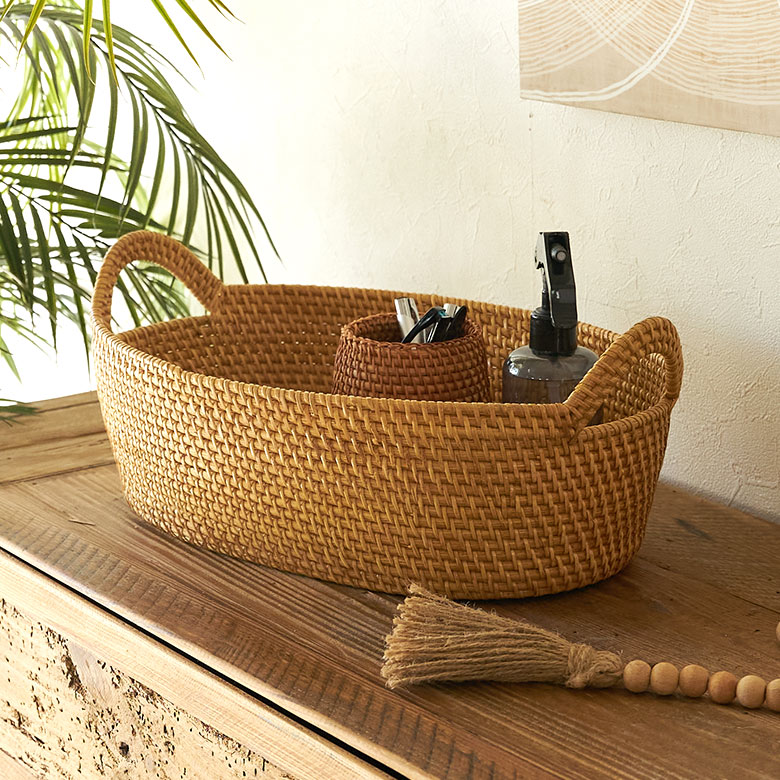 インドネシアの高品質な天然ラタンを使用し、バリ島の熟練した職人がハンドメイドで一つひとつ丁寧に仕上げたバスケット ラタンで編まれたハンドル付きの浅型オーバル収納バスケット(Sサイズ)[14178]