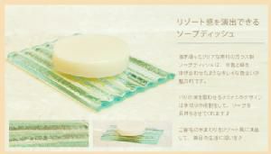 | クリアな素材が綺麗な、ガラスで出来たソープディッシュ。まるでバリの波を思わせるような ナミナミのデザインがソープディッシュ全体に施してあります。ソープを長持ちさせる水切りとしての機能的な役割 もあり、まさにデザイン性と機能を併せ持ったソープディッシュです。ガラス製ですので、丈夫で水に強く、掃除もラクラクなのも嬉しいですね♪シンプルなデザインですので他にも、小物を飾るデコレーショントレイなどにもお使い頂ける、万能なアイテムです。 | ||||