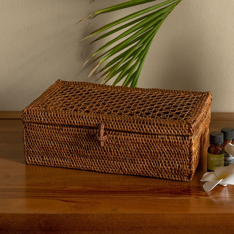 生活感が出やすい小物や日用品をすっきりと隠して収納できるため、リビングやダイニング、洗面スペースなどでも美しい空間を保てます。置くだけでアジアンリゾートのような雰囲気を演出するアタケースは、小物入れとしてはもちろん、ティッシュケースとしても使えるインテリア性の高いアジアン収納です。