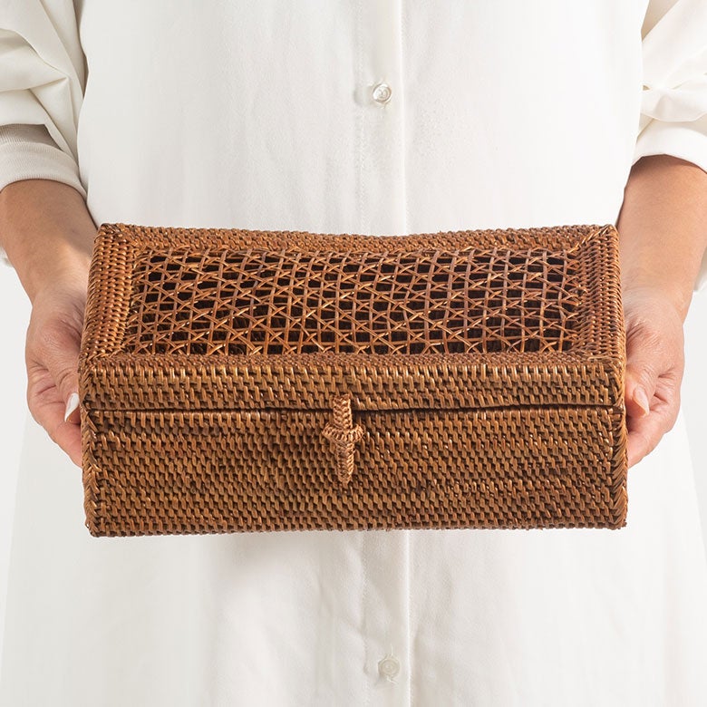 インドネシアの職人がひとつひとつ丁寧に編み上げた、アタ製の蓋付き小物入れケース。天然素材アタならではの細やかな編み目と、燻しによって生まれる深みのある色合いが魅力です。