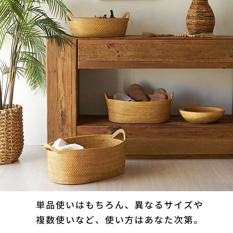 こちらはお得なS・M・Lの3個セット。カラーは、ラタンそのものの自然な風合いを楽しめるナチュラルと、落ち着いた深みのある色合いがアジアンムードたっぷりなダークブラウンの2色展開。3サイズでスタッキングもできるので、使わない時は場所をとらず省スペースに収納できて便利です。単品使いはもちろん、異なるサイズや複数使いであなただけの使い方を楽しんで。
