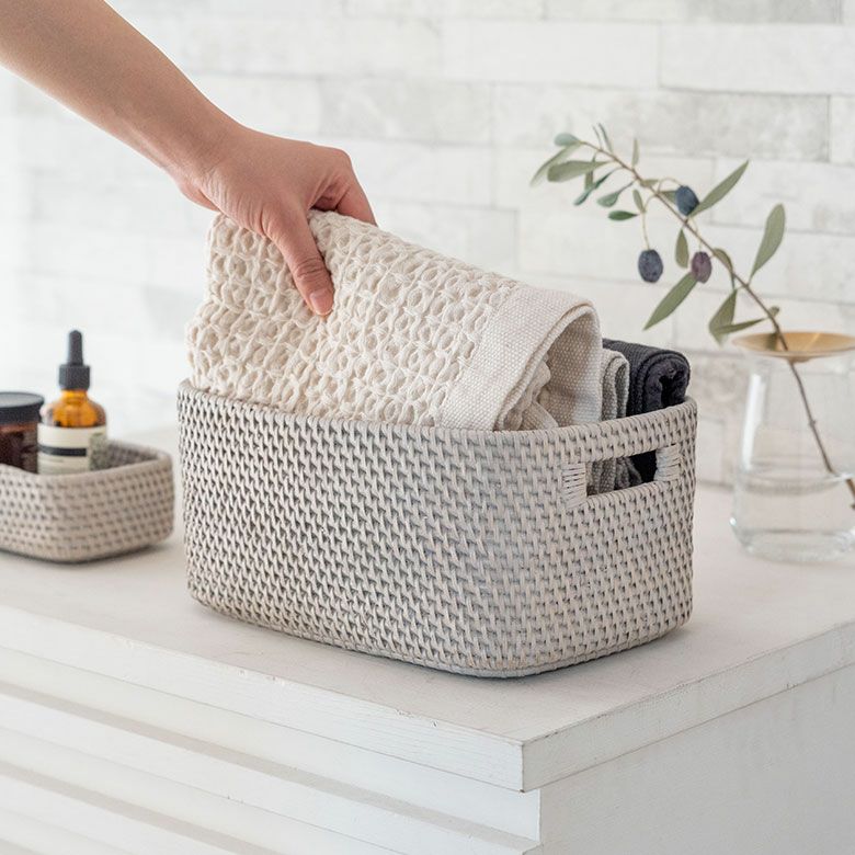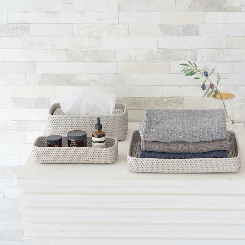 洗面台まわりで活躍するトレイやバスケット、小物入れなど