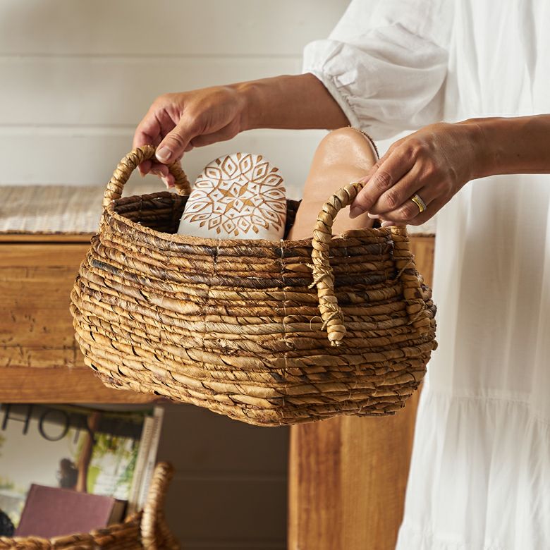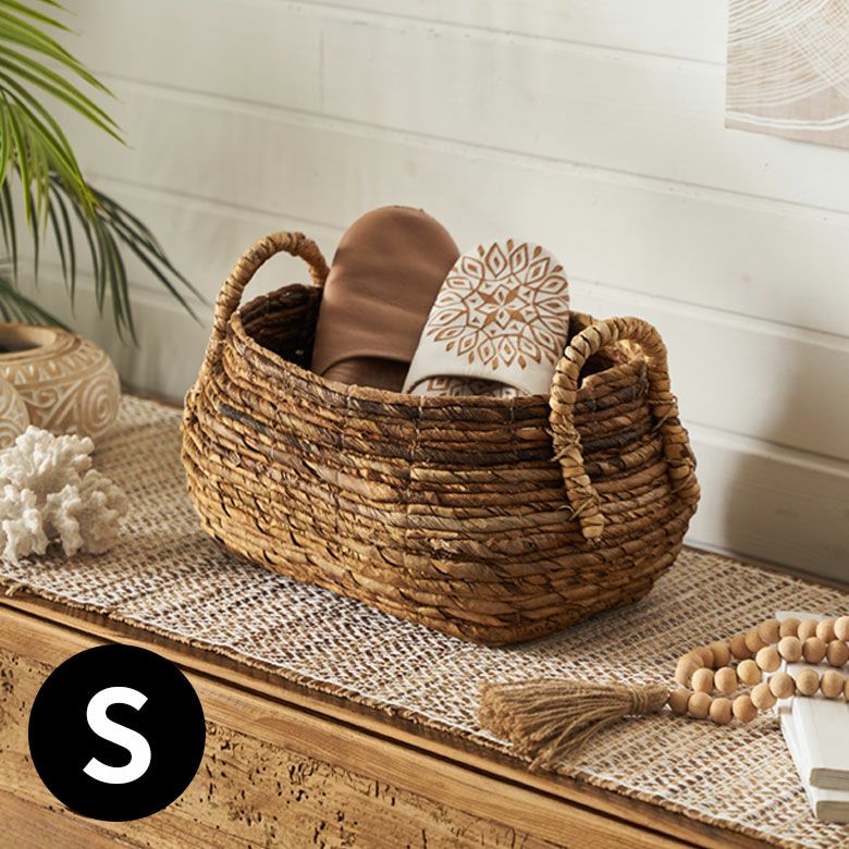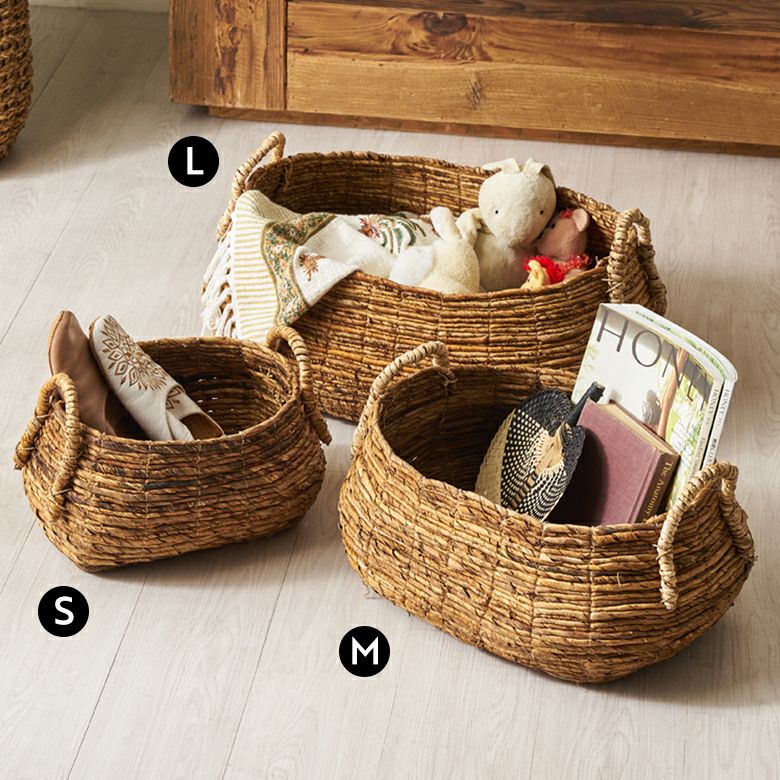 サイズはS、M、Lの3サイズ展開。Sサイズは、スリッパ収納や雑誌や散らかるインテリア雑貨の収納として便利なサイズ。キッチンで果物やお菓子をおしゃれに収納したり、キッチンアイテムを入れておくバスケットとしても。あなただけの使い方で暮らしを楽しんで。