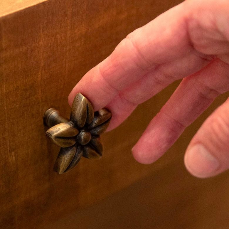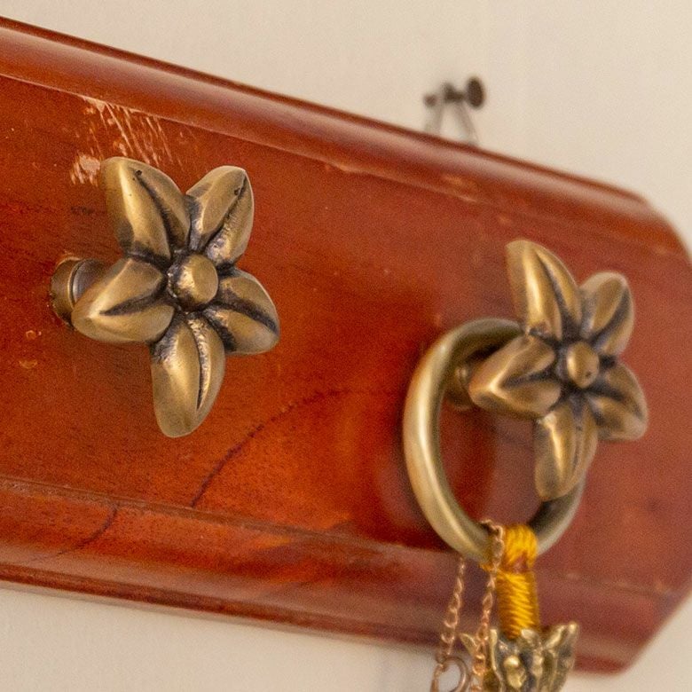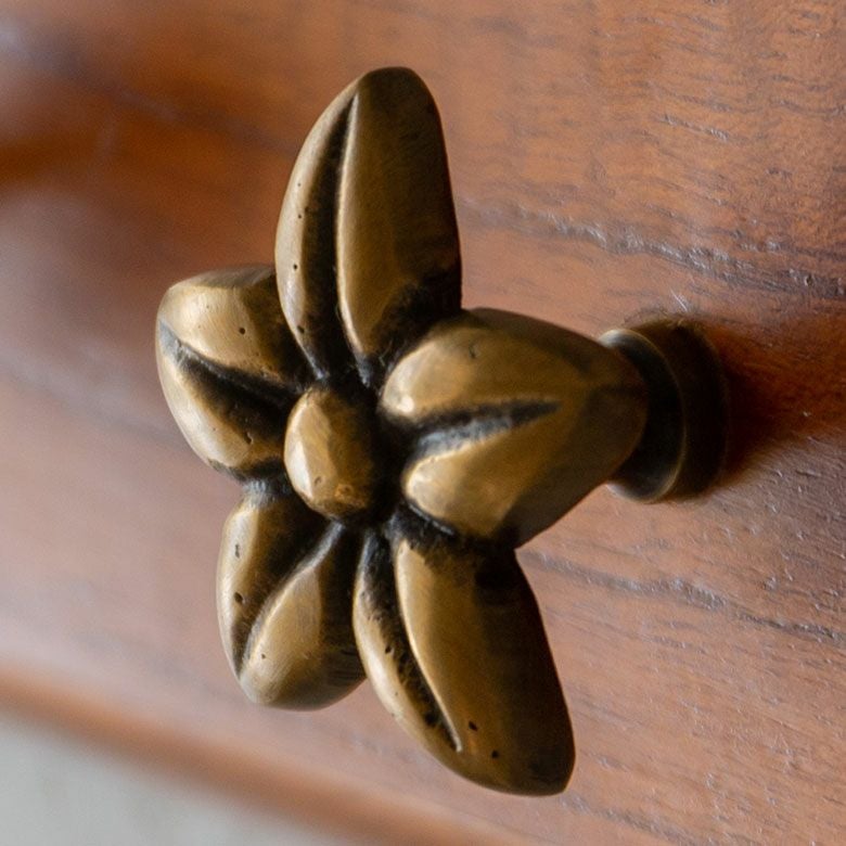 南国リゾートの雰囲気漂う、プルメリアデザインの真鍮ハンドル。