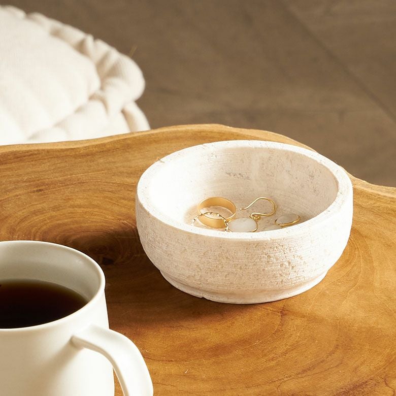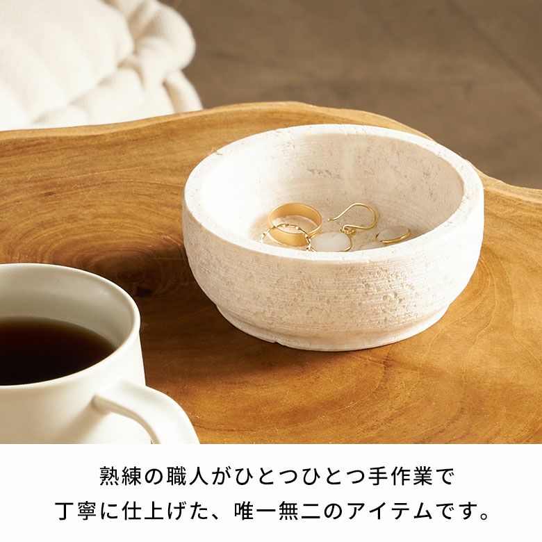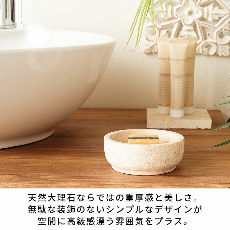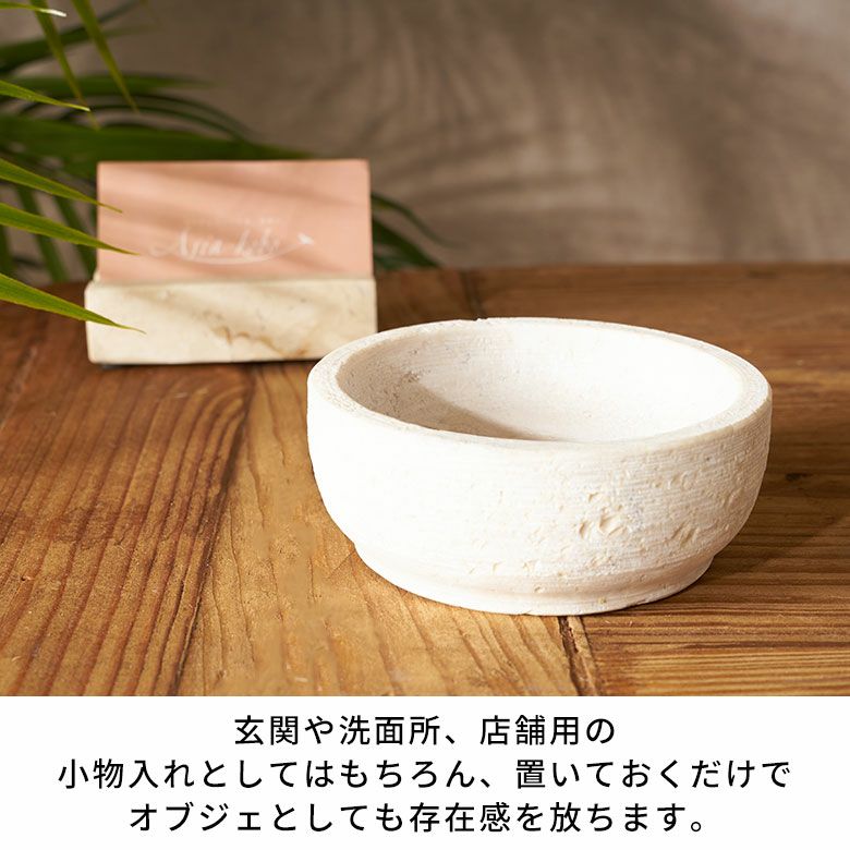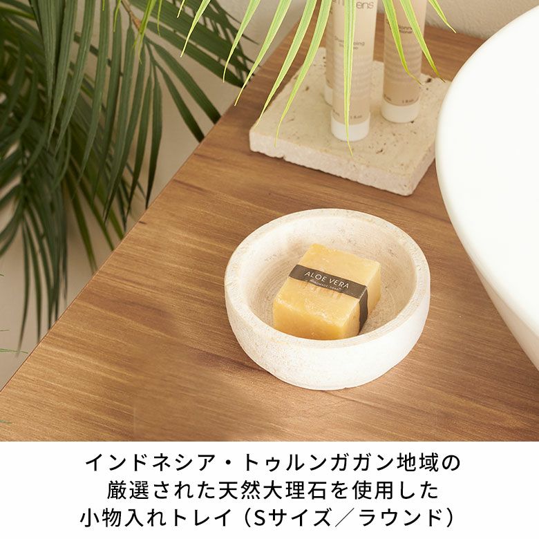 直径10cmのSサイズと、少し浅型でツヤのある直径14cmのMサイズの2サイズ展開。単品使いはもちろん、質感違いで組み合わせたセット使いもオススメです。天然大理石の素材そのものの魅力が引き立つ洗練された小物入れトレイは、ワンランク上のアジアンリゾートのような雰囲気を演出します。