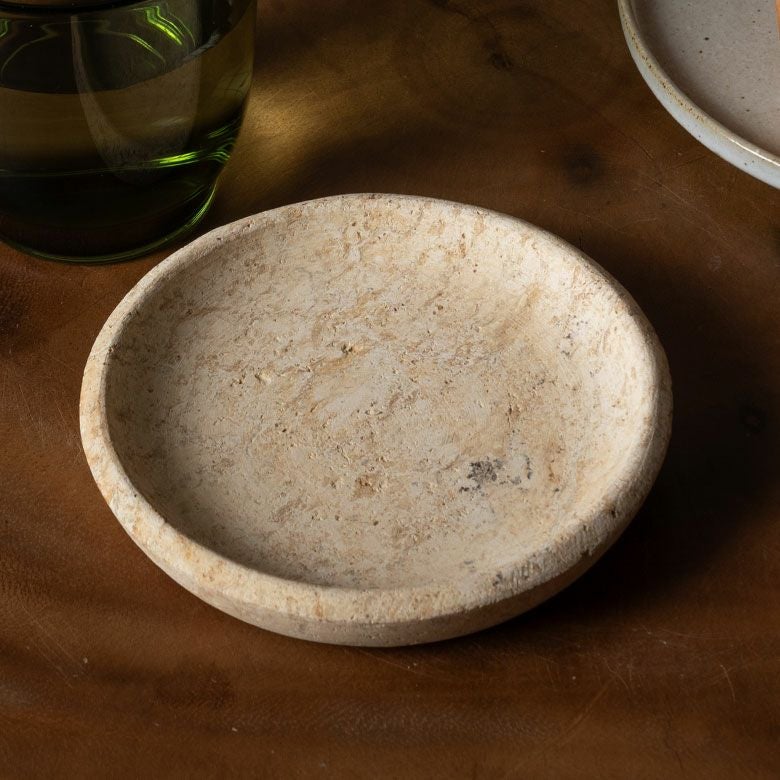 砂岩特有のマットで素朴な質感は、アクセサリーや香木などをさりげなく引き立て、空間に原始的で静かな存在感を添えます。均一に整えられた量産品とは異なり、自然素材ならではの揺らぎや個性が感じられる佇まいが魅力です。