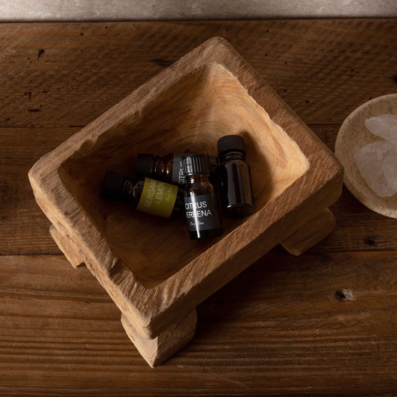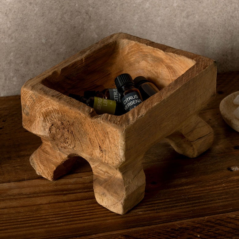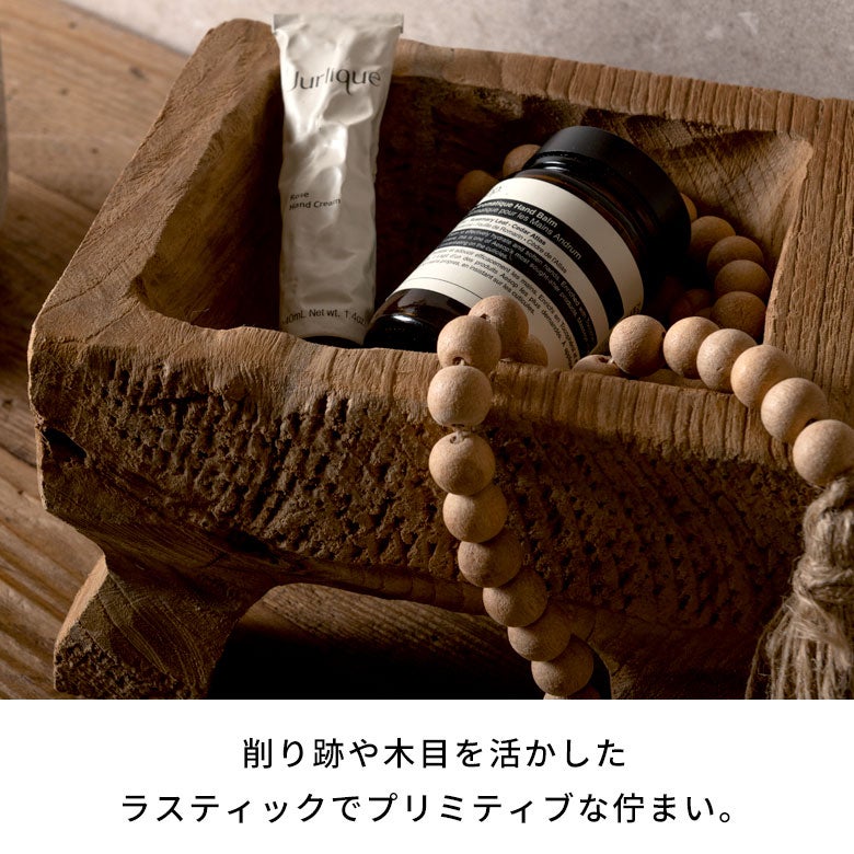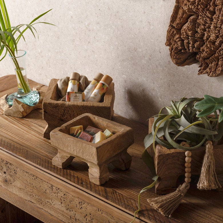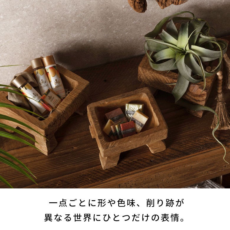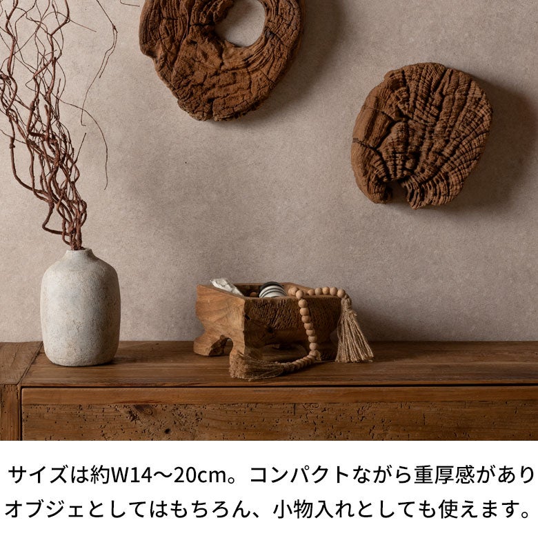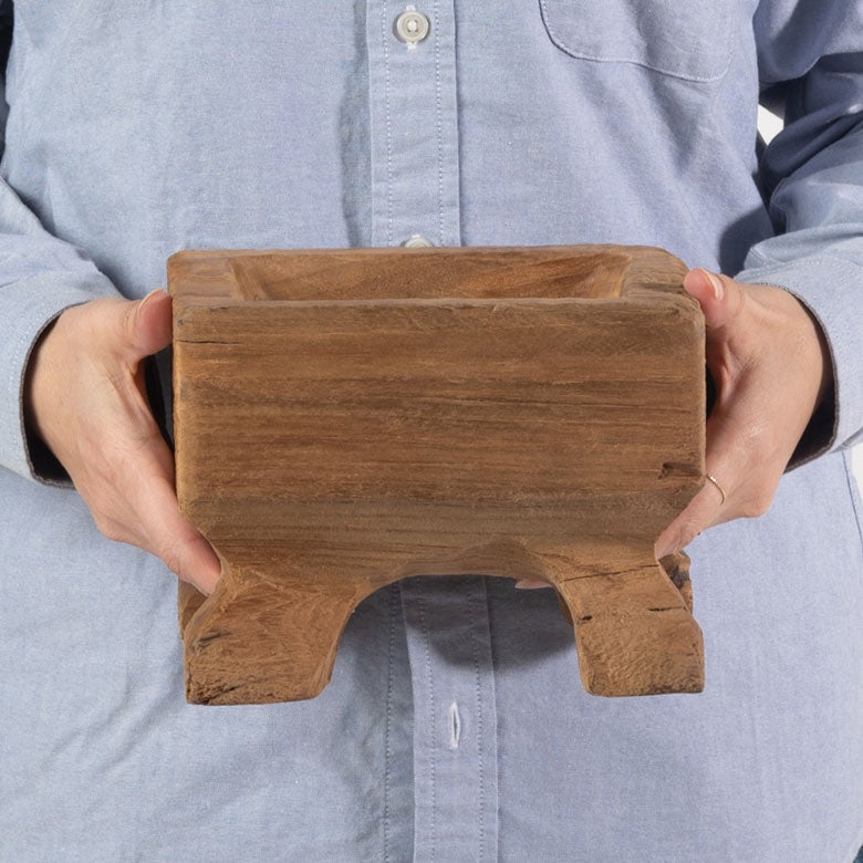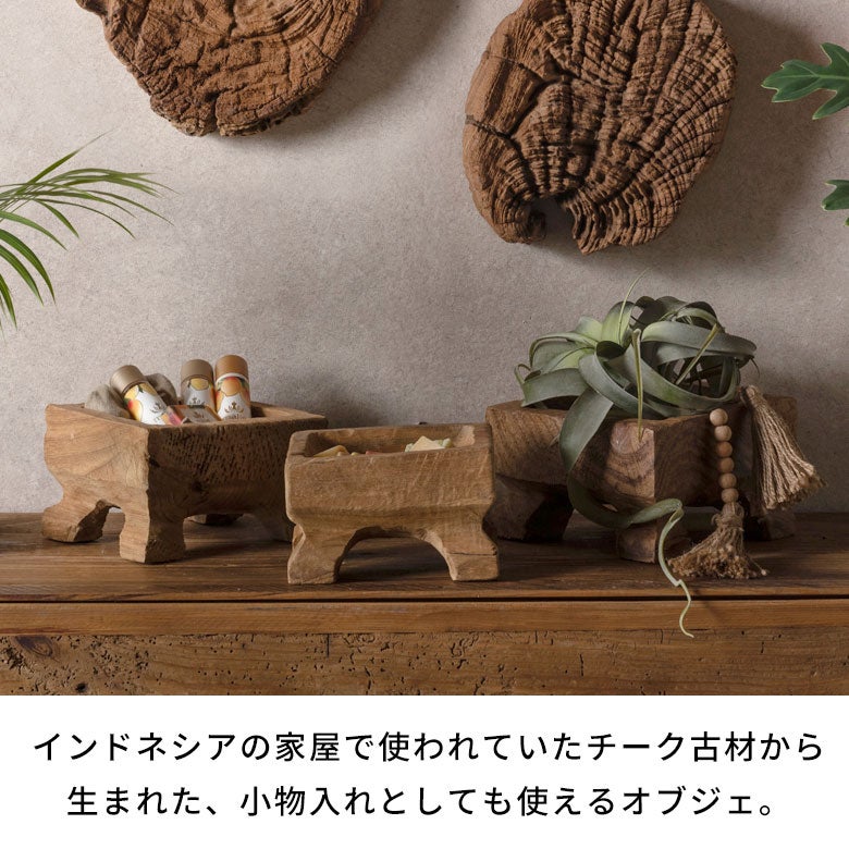 かつてインドネシアの家屋で使われていたチーク古材から生まれた、小物入れとしても使えるオブジェ。長い年月を経て刻まれた木肌の表情を活かし、素材そのものの力強さを残したアップサイクルのインテリアです。