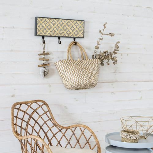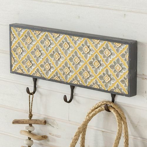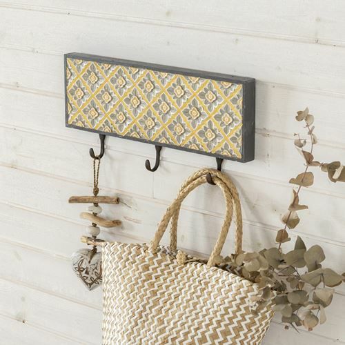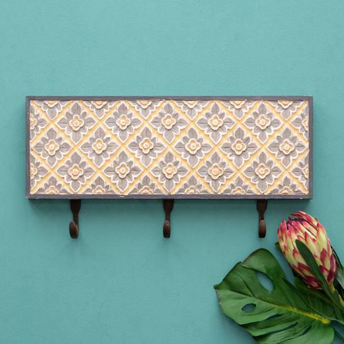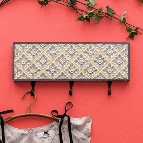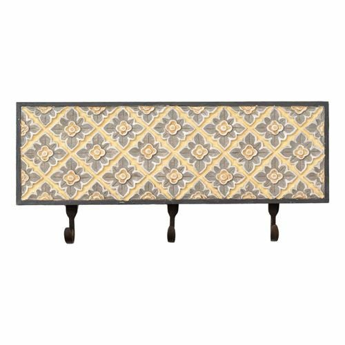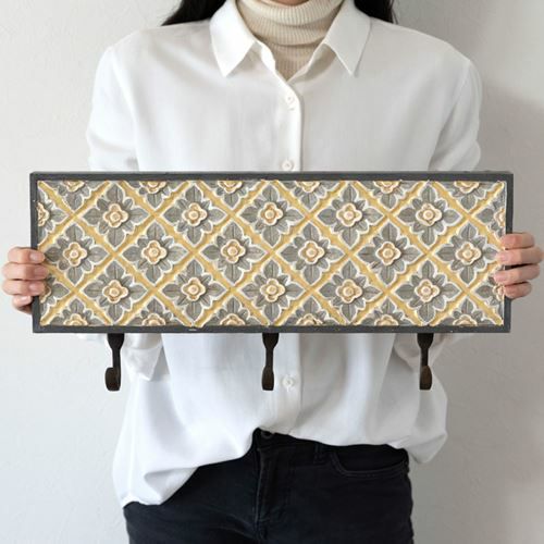 壁掛けフック 木彫り風 引掛け収納 壁掛け収納 吊るす おしゃれ フック 壁掛け 3連フック 木彫り風 イエローフラワー 約45.5cm×21cm[13625] 【 ウォールフック 壁掛けフック コート掛け 帽子掛け ストール ショール マフラー シンプル ナチュラル 引っ掛け カバン掛け コートフック 帽子かけ 玄関 収納 アジアン雑貨 バリ島 】