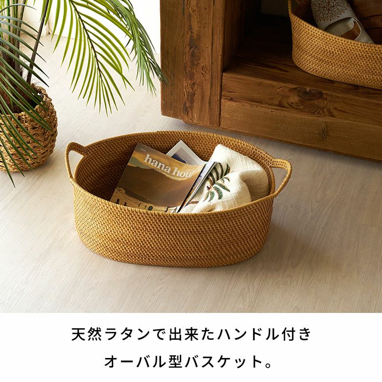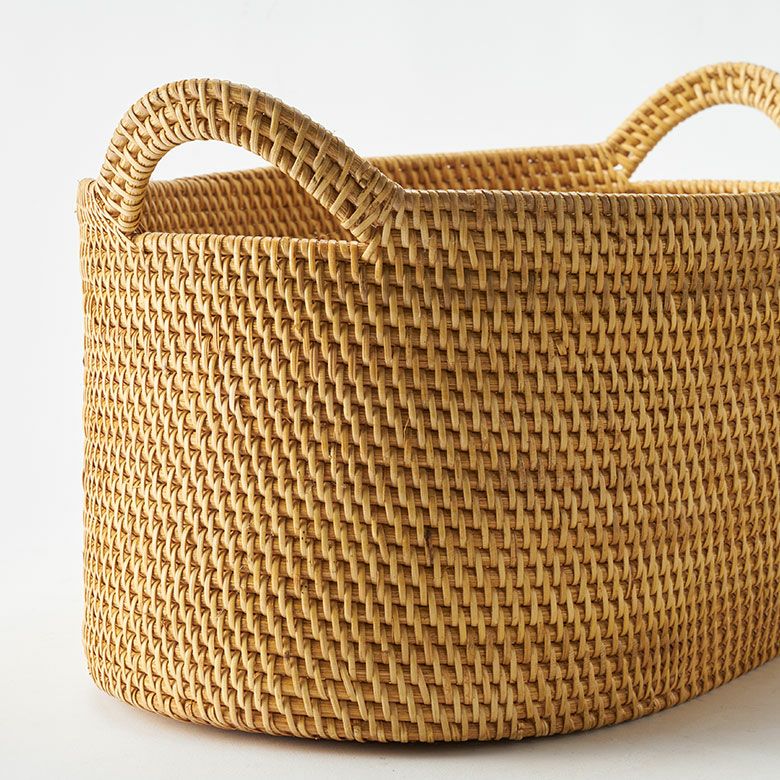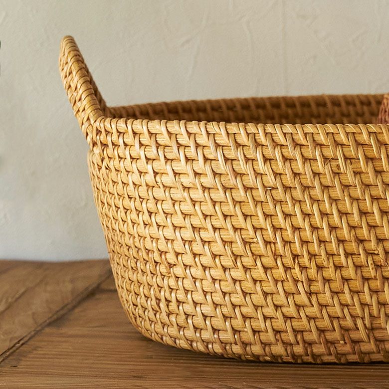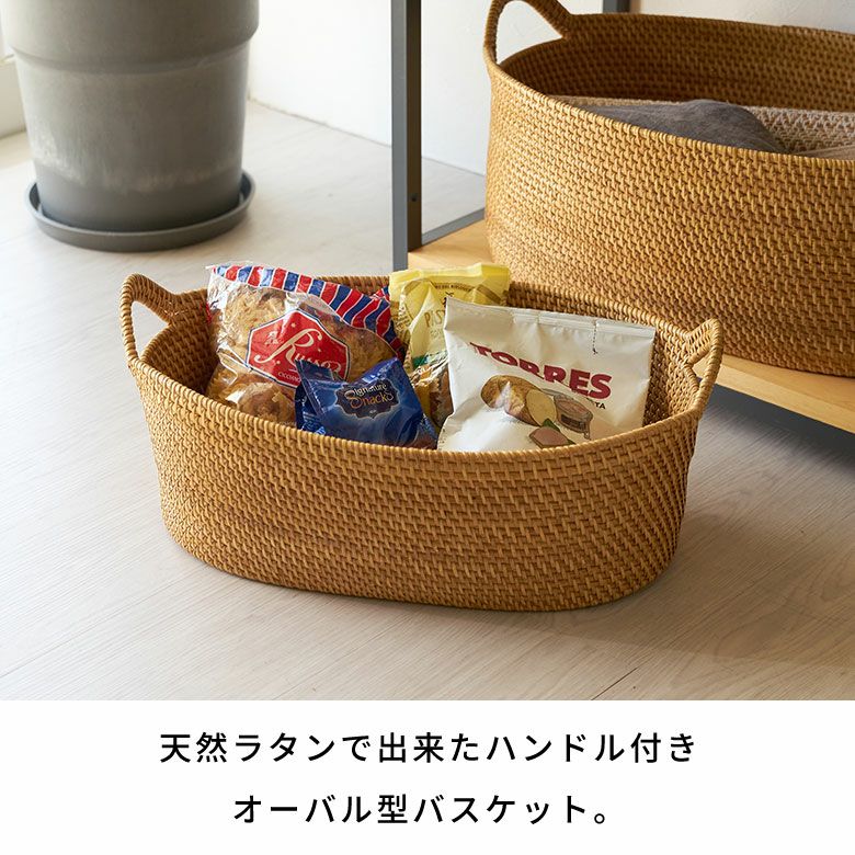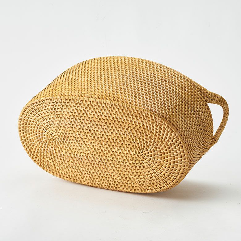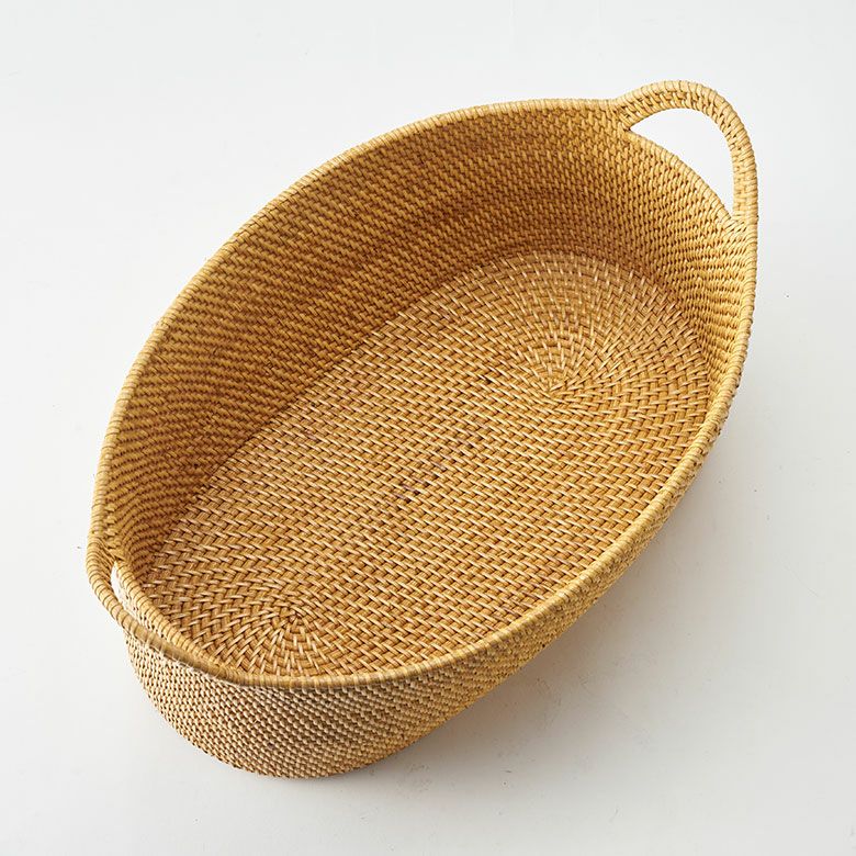 インドネシアの高品質な天然ラタンを使用し、バリ島の熟練した職人がハンドメイドで一つひとつ丁寧に仕上げたバスケット ラタンで編まれたハンドル付きの浅型オーバル収納バスケット(Mサイズ)[14179]