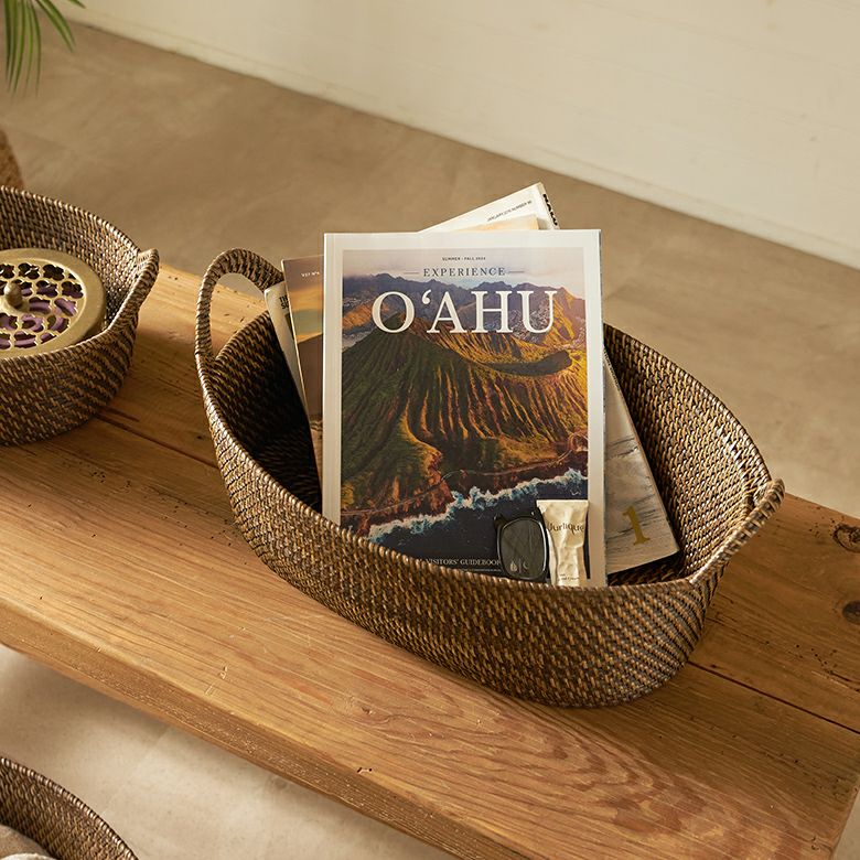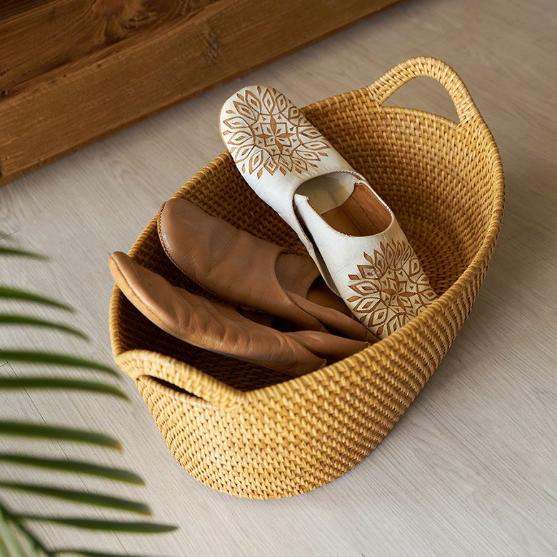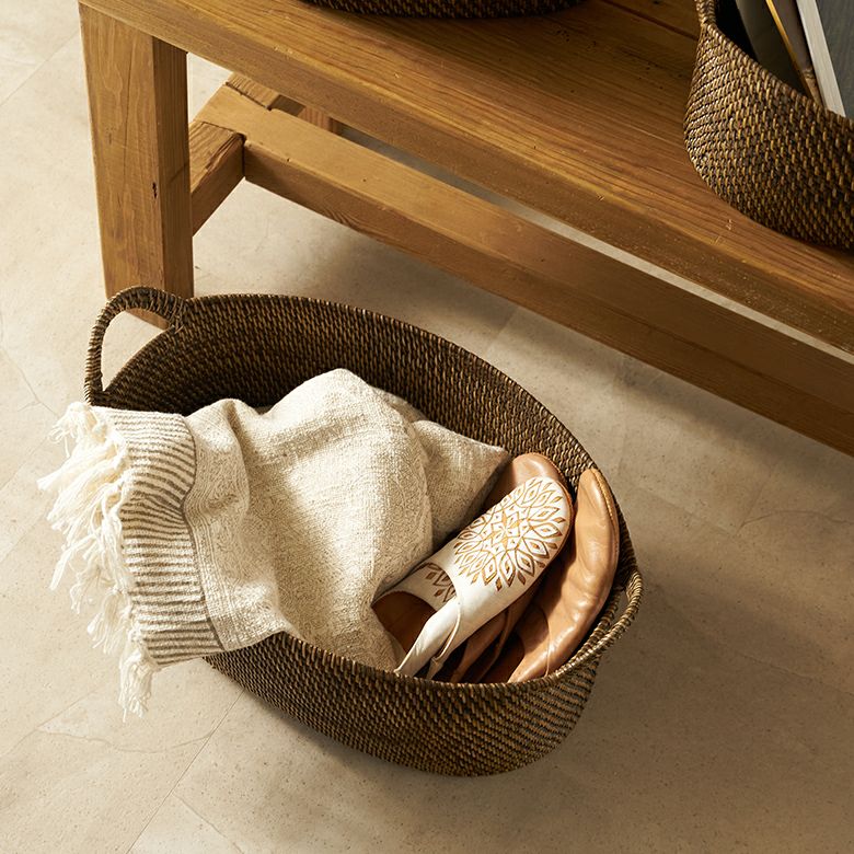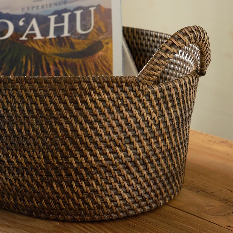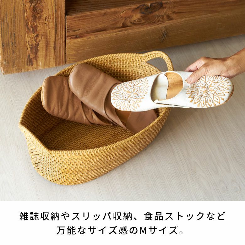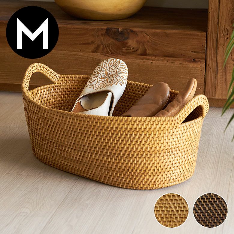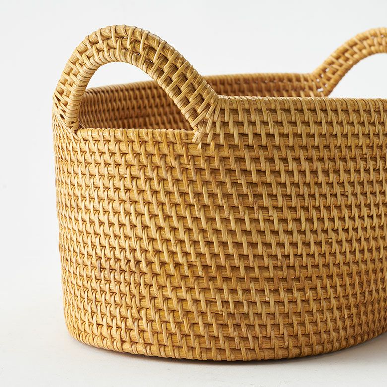 インドネシアの高品質な天然ラタンを使用し、バリ島の熟練した職人がハンドメイドで一つひとつ丁寧に仕上げたバスケット ラタンで編まれたハンドル付きの浅型オーバル収納バスケット(Mサイズ)[14179]