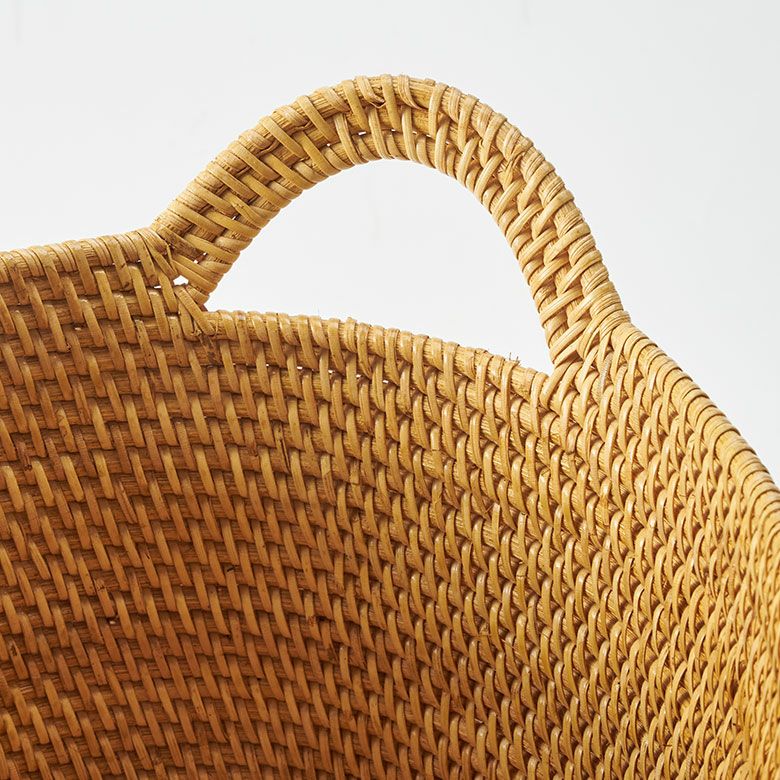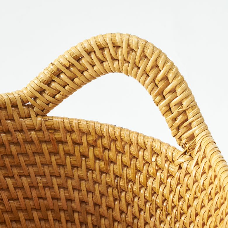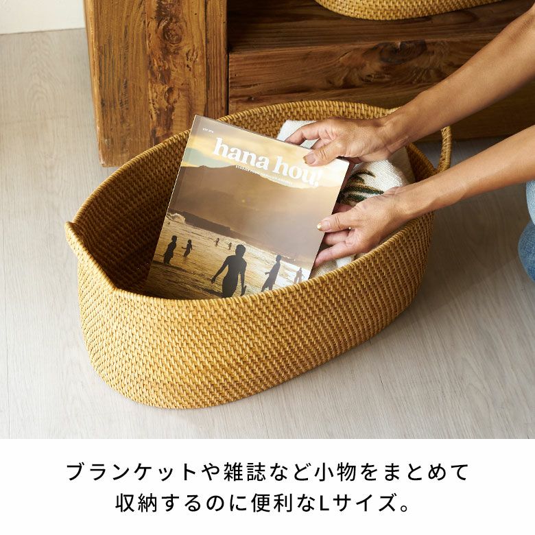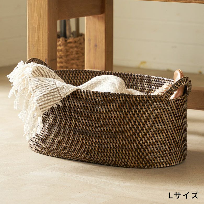 インドネシアの高品質な天然ラタンを使用し、バリ島の熟練した職人がハンドメイドで一つひとつ丁寧に仕上げたバスケット ラタンで編まれたハンドル付きの浅型オーバル収納バスケット(Lサイズ)[14180]